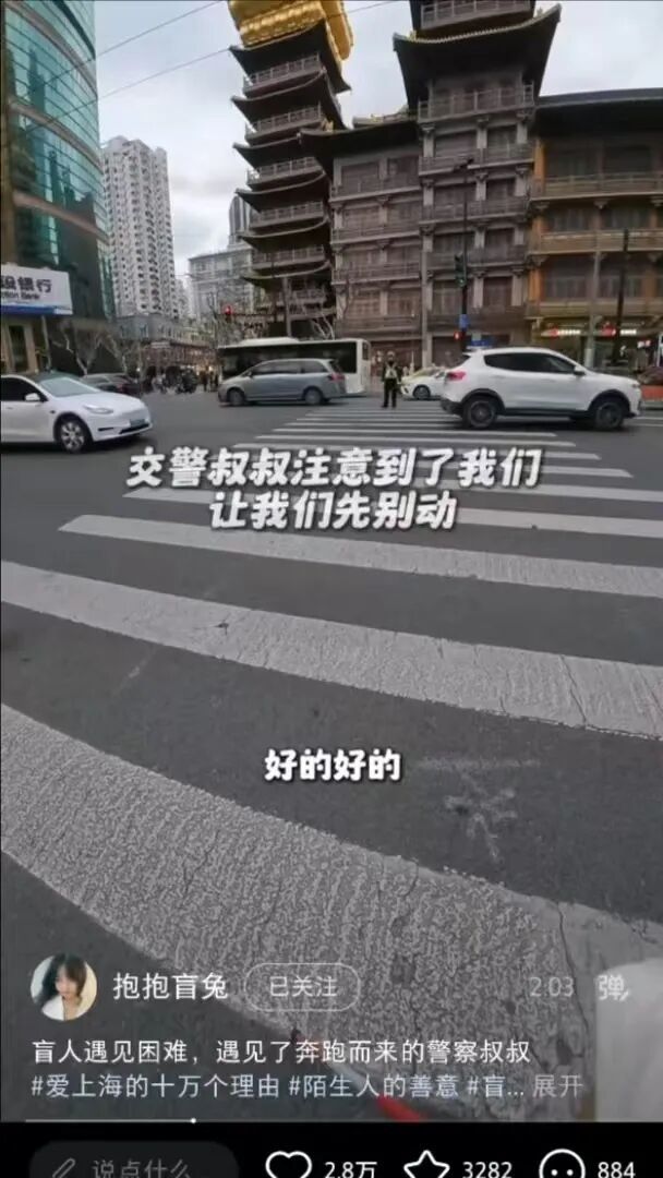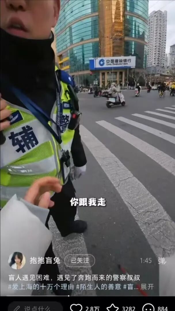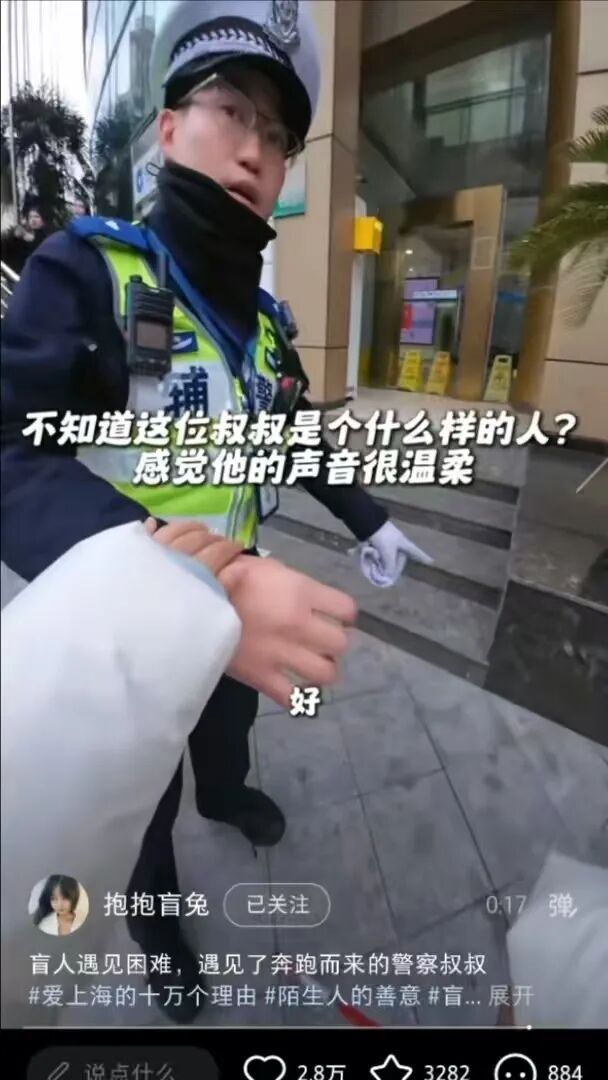 近日,视力障碍博主“抱抱盲兔”发布的一段短视频,在社交平台迅速走红,点赞很快突破万条,网友纷纷为视频中暖心相助的辅警点赞。这段视频,记录下了博主在上海静安街头求助后,被温柔守护的珍贵瞬间。