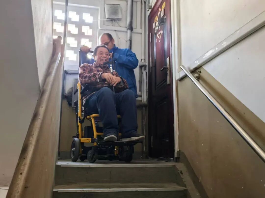 当天,祥德新苑内暖意融融。工作人员正小心翼翼地将史老伯固定在专业爬楼机上,一边操作一边轻声安抚:“爷叔,您第一次坐爬楼机,下去的时候头往后面靠,就像坐躺椅一样,放轻松,不用紧张,准备下去了。”