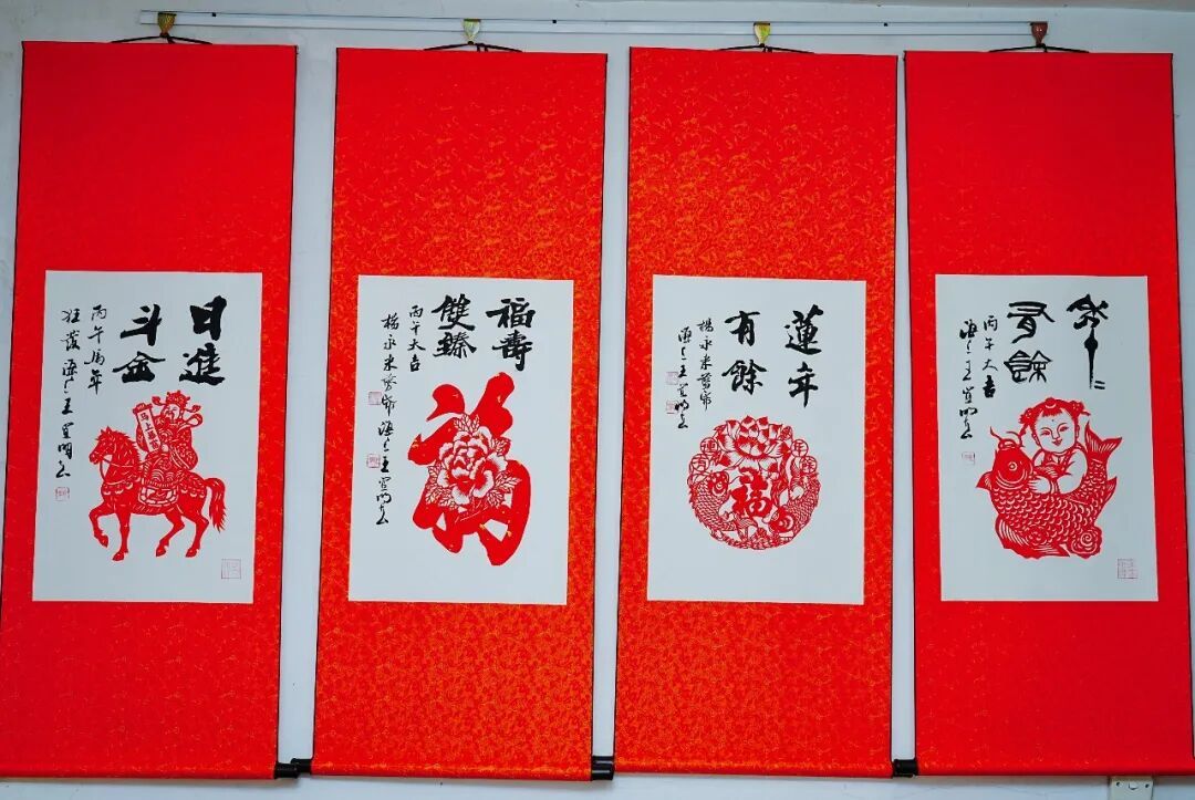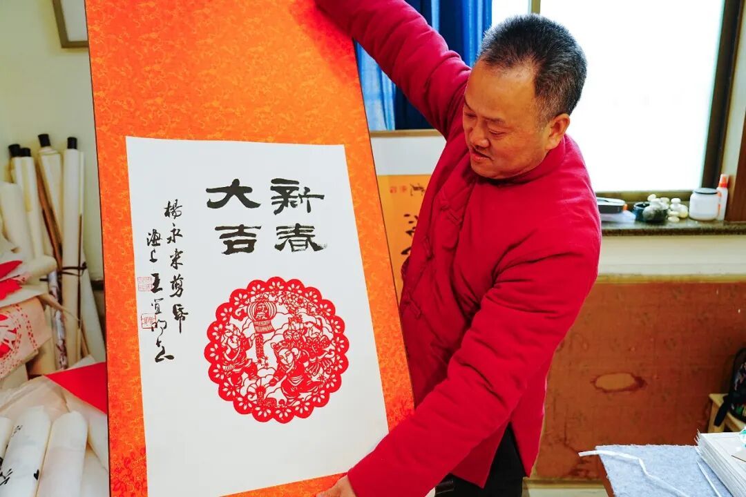 剪纸裁春韵,骏马送福来。随着指尖翻飞,红色的纸屑如雪花般轻轻飘落——在徐泾剪纸达人杨永来的手中,一幅骏马迎春的窗花渐渐鲜活起来,仿佛能听见新春欢快的脚步声。 每逢岁末,为新年剪出一系列生肖主题作品,已成为杨永来的习惯。临近春节,杨永来的工作室化身为一片喜庆的“红色海洋”,《马到成功》《马踏飞燕》《龙马精神》等新作跃然眼前。杨永来向记者介绍道:“这幅剪纸作品取名龙马精神,我觉得这是我们中国人骨子里的精气神,寓意像龙马一样昂扬向上、自强不息。”这些作品巧妙融合了骏马、福字、锦鲤、牡丹等吉祥元素,线条流畅,生机盎然,将新春的期盼与祝福凝结于方寸之间。 剪纸▼ 杨永来的剪纸情缘,深深植根于儿时陕西故乡的年味记忆。“母亲会用锅底灰描样,剪出各式窗花,贴上窗户,年味立刻就浓了。”这份对传统年俗的眷恋,让他在五年前通过自学钻研,让这份传统技艺在自己的生活中焕发光彩。凭着一份热爱,他剪出了花鸟虫鱼的生动,也剪出了人间烟火的情味。 众多新作中,《吉庆有余》格外喜人。一个憨态可掬的娃娃抱着一条大鲤鱼,寓意着“年年有余,人丁兴旺”。杨永来还为它配上书法题字和一枚小小的印章,让传统的剪纸一下子多了几分文人雅趣。 更可贵的是,杨永来让剪纸从个人爱好“走”向了更广阔的社区空间。他不仅举办个人剪纸作品展,更长期化身社区传统文化传播者。“通过现场互动能让大伙儿亲手感受剪刀和纸之间的乐趣。”新春前夕,他总会带着作品走进社区,和大家一起贴窗花、做手工,零距离的互动带来欢声笑语和浓浓的年节气氛。他的作品形式也越发多样,有的被精心装裱成卷轴画框,成为馈赠亲友的佳礼;有的则化身为小巧的书签、灯笼等文创产品,让传统艺术以更轻盈的方式走进人们的日常。