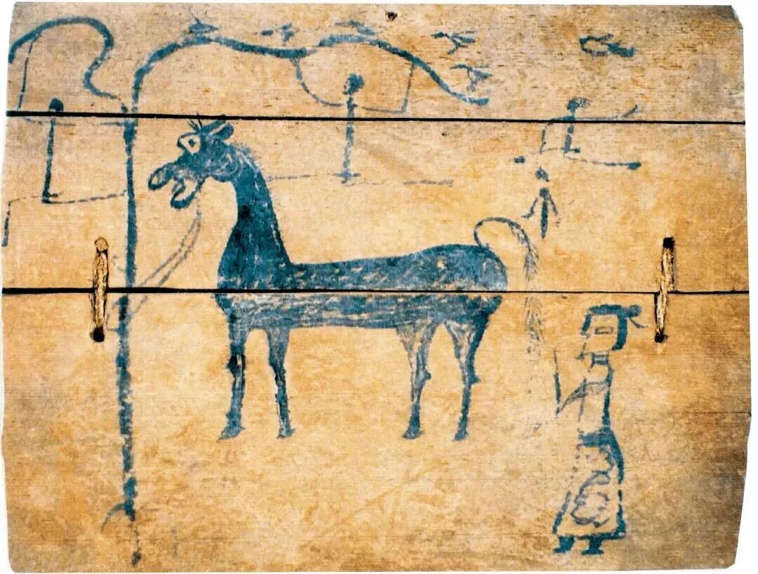 虽然文字记载的向上追溯止步于北魏,但图像的呈现则可以提早到汉代,而且图像更加直观形象。1973年在肩水金关遗址(今甘肃金塔县)出土了由三块木板拼成的一幅画,学界多称之为“马厩图”: