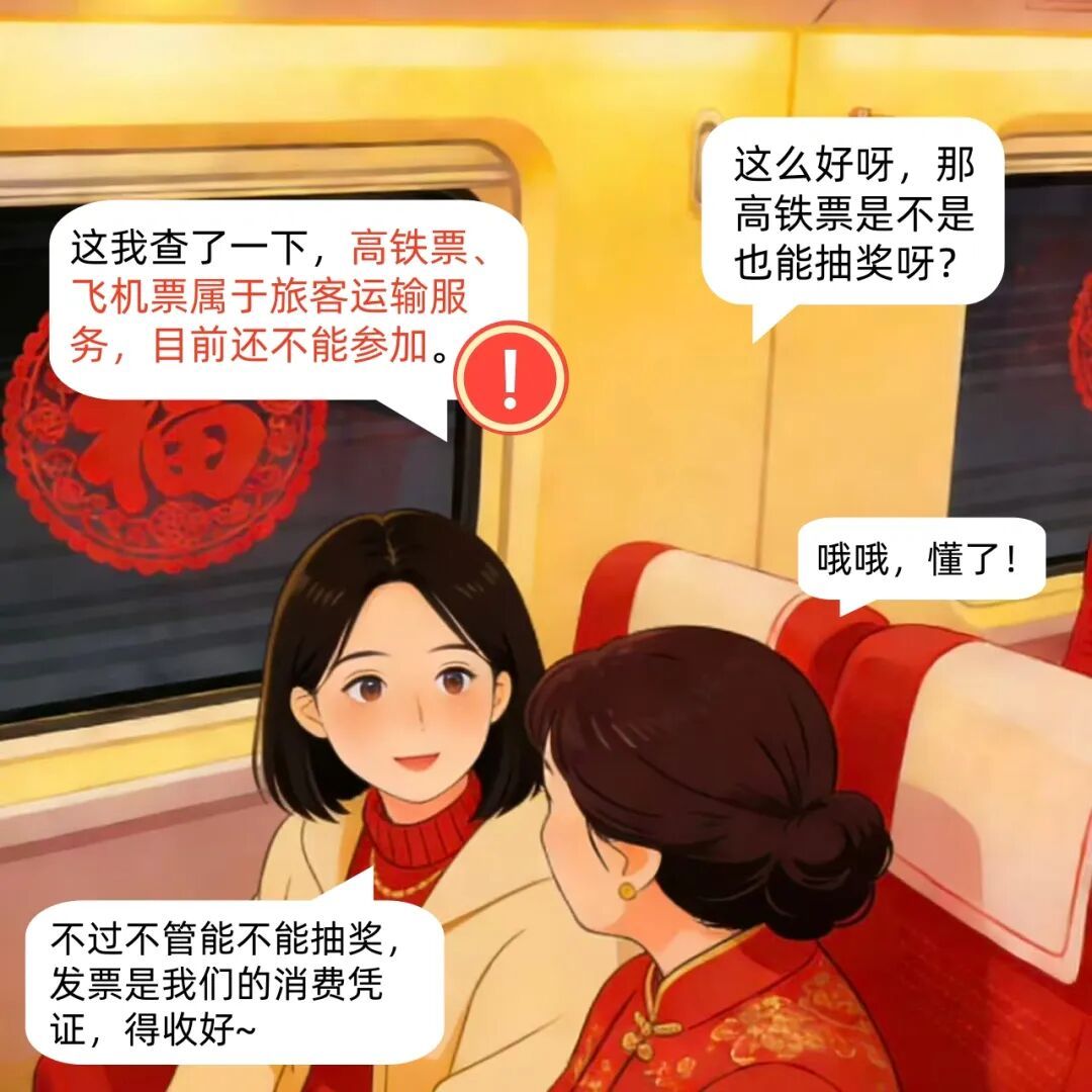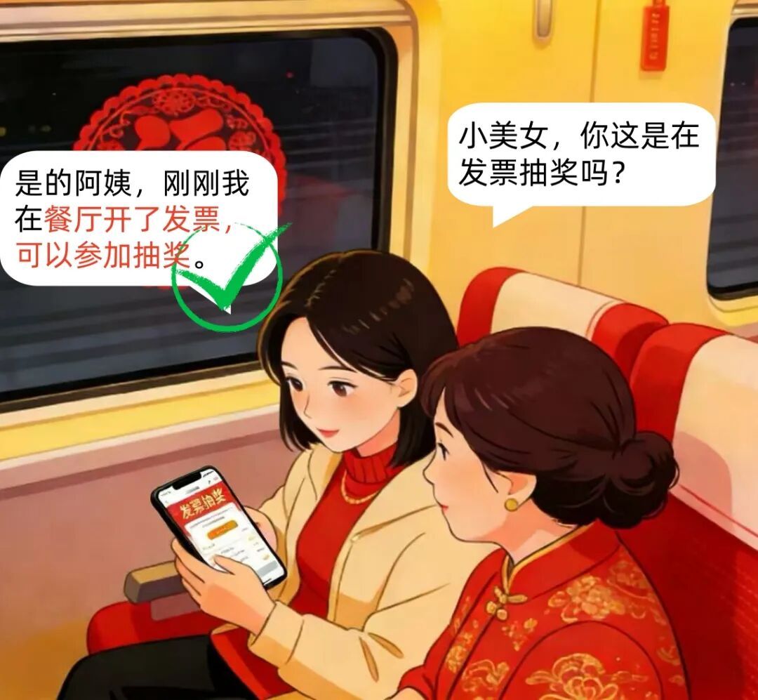 高铁上,小美在手机上查看发票抽奖界面,邻座阿姨搭话。