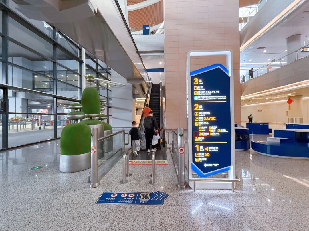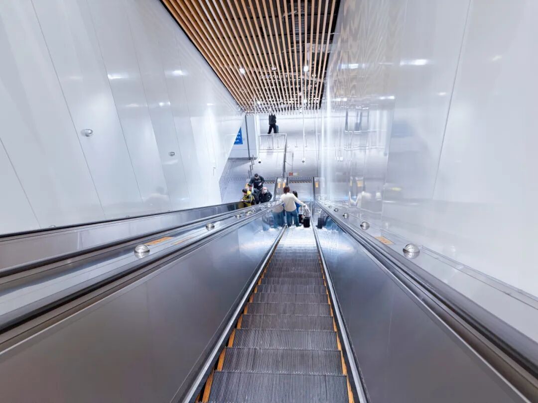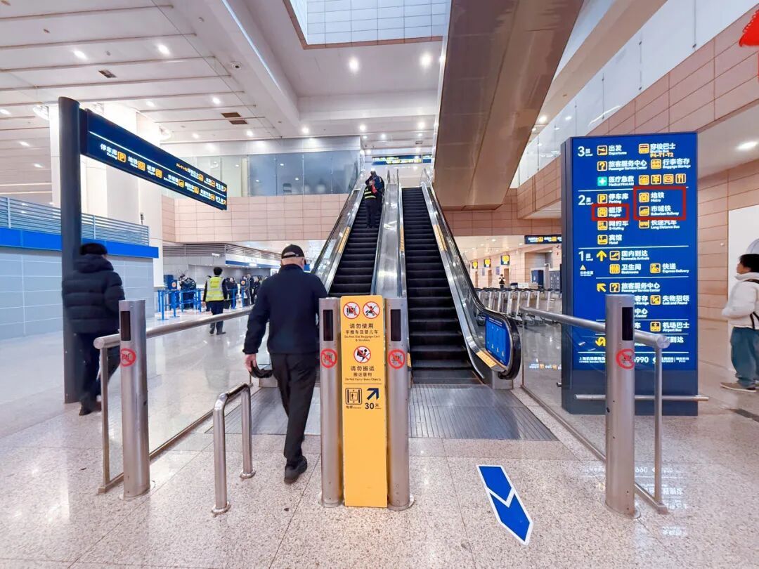 乘坐市域线机场联络线的旅客根据标识,乘坐电梯前往换乘大厅↓