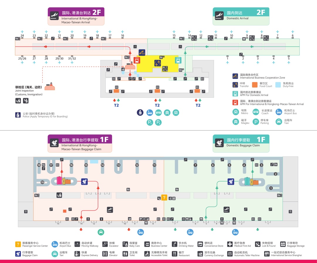 先乘坐电梯到达二层,然后按照上述路线换乘轨道交通2号线、磁浮线、市域线机场联络线↓