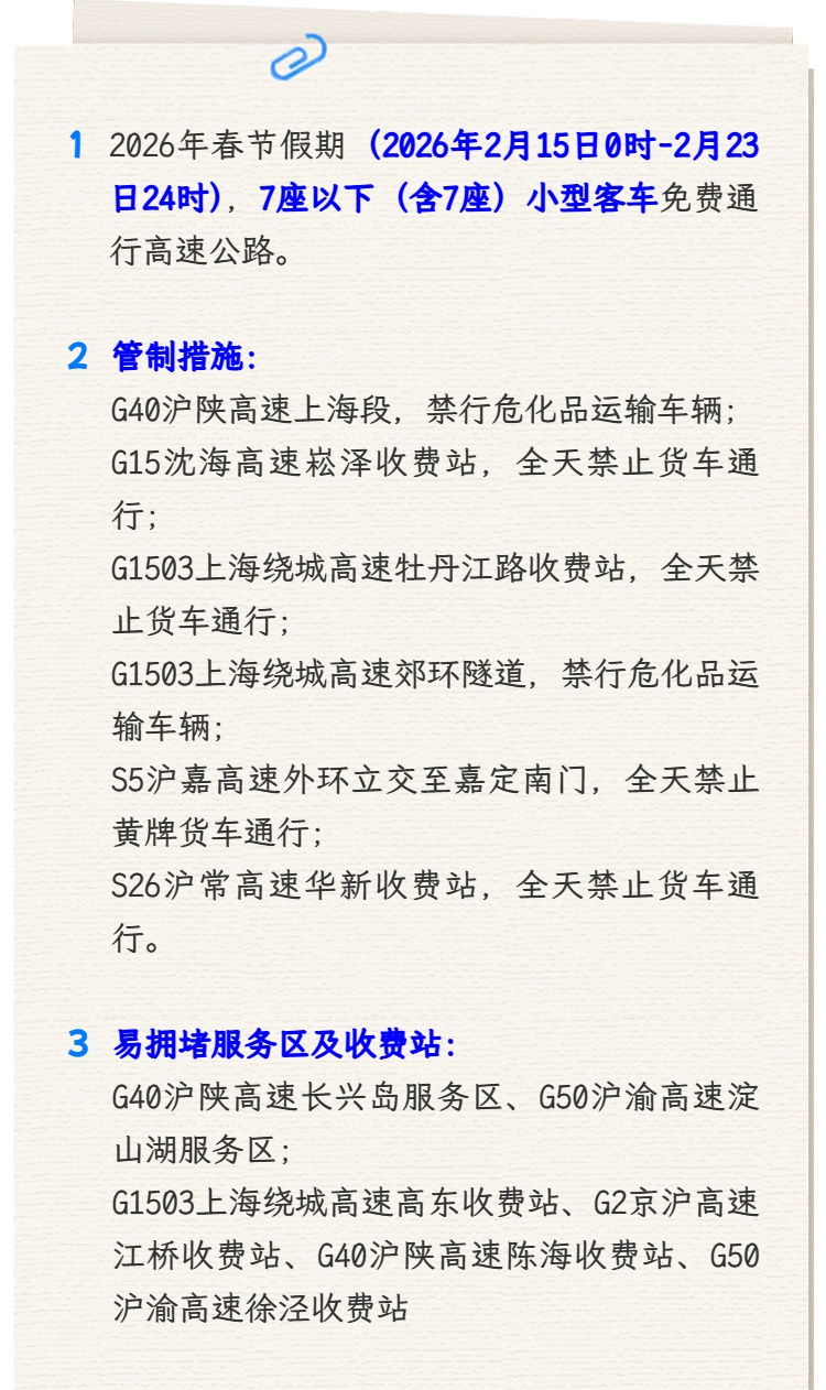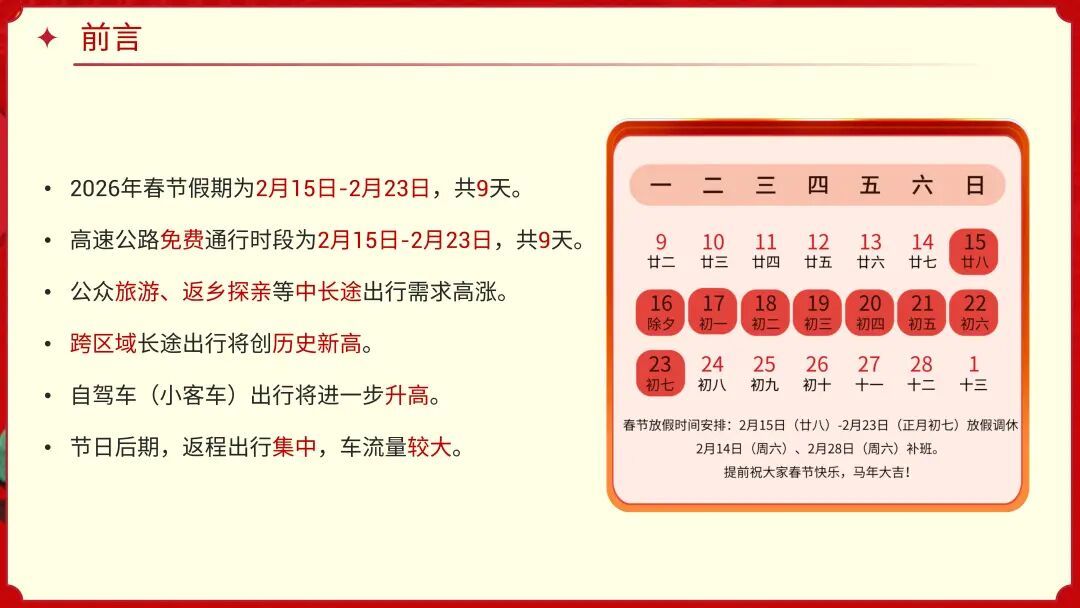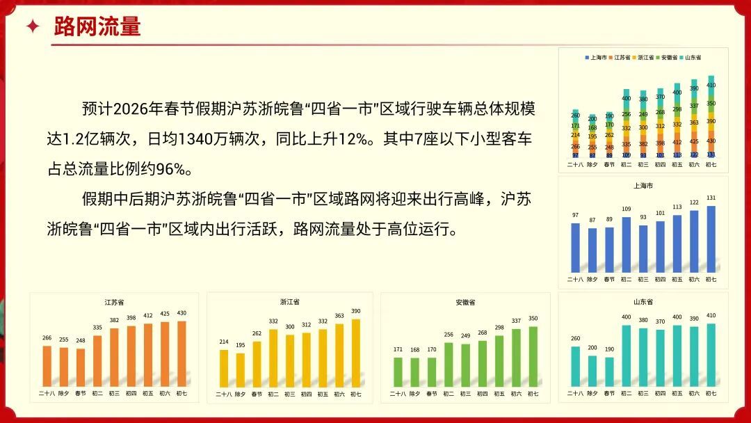 丙午新岁,策马扬鞭。市交通委指挥中心分享了一份2026年春节沪苏浙皖鲁“四省一市"高速公路出行服务指南,一起来看看吧!