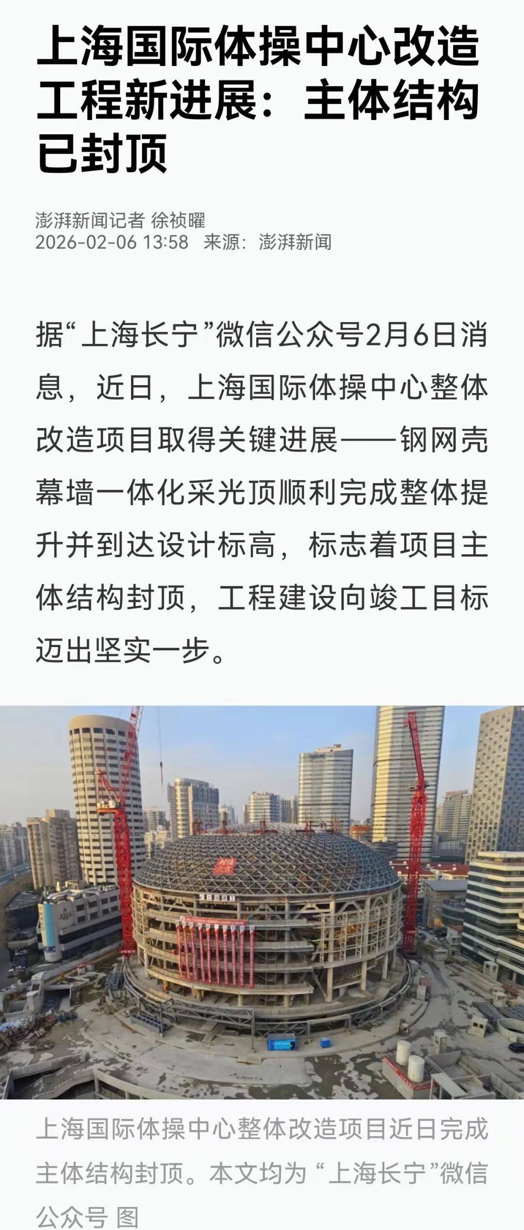 2月6日,澎湃新闻报道:近日,上海国际体操中心整体改造项目取得关键进展——钢网壳幕墙一体化采光顶顺利完成整体提升并到达设计标高,标志着项目主体结构封顶,工程建设向竣工目标迈出坚实一步。