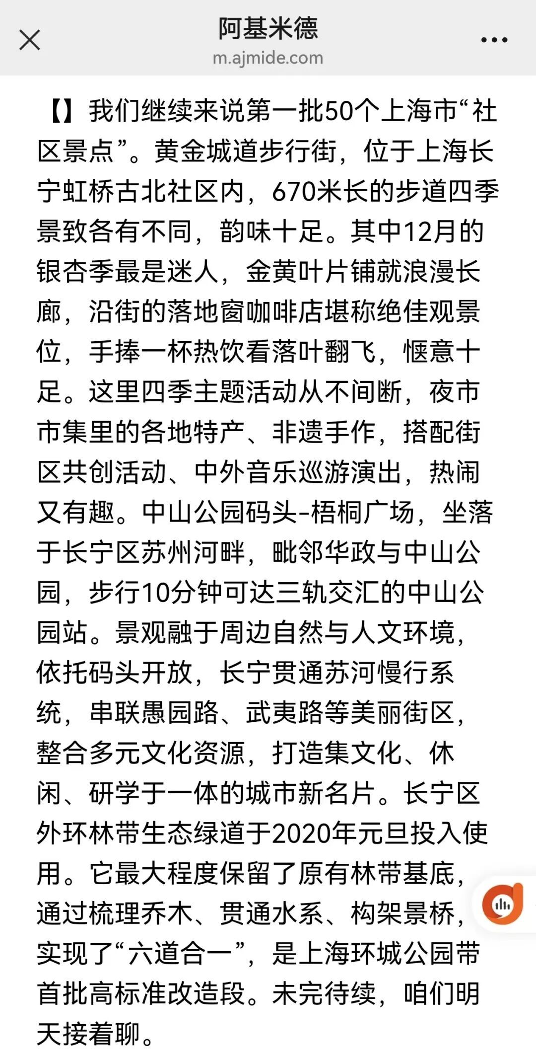2月10日,上海人民广播电台“为您服务”栏目报道:近日,第一批50个上海市“社区景点”公布。黄金城道步行街位于虹桥古北社区内,670米长的步道四季景致韵味十足。这里四季主题活动从不间断,夜市市集里的各地特产、非遗手作,搭配街区共创活动、中外音乐巡游演出,热闹又有趣。中山公园码头-梧桐广场,坐落于长宁区苏州河畔,毗邻华政与中山公园,步行10分钟可达三轨交汇的中山公园站。景观融于周边自然与人文环境,依托码头开放,串联愚园路、武夷路等美丽街区,整合多元文化资源,打造集文化、休闲、研学于一体的城市新名片。长宁区外环林带生态绿道,通过梳理乔木、贯通水系、构架景桥,实现了“六道合一”,是上海环城公园带首批高标准改造段。