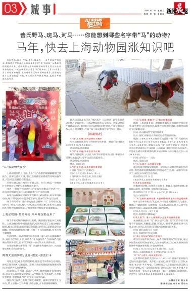 2月9日、10日,《文汇报》要闻版、《新闻晨报》、劳动报网、上观新闻、新闻综合频道“新闻报道”“上海早晨”“新闻坊”栏目、东方卫视“东方新闻”“看东方”栏目、上海人民广播电台“990早新闻”栏目、阿基米德APP、周到上海APP、澎湃新闻、青春上海、看看新闻网、东方网报道:2月10日至3月3日,上海动物园将以“万马奔腾 共绘新春”为主题,举办马年生肖文化系列活动。此次活动深度融合文化、商业、旅游与展览,旨在为市民游客呈现一场集科普教育、生态保护与传统节庆于一体的新春文旅盛宴。本次活动也是区域文旅协同发展的重要实践。上海动物园作为长宁区“烟火长宁 马上焕新”新春主题活动的核心组成部分,深度融入区域文旅推广网络。同期,园内将举办国际少儿生肖绘画作品展,并联动全国六十余家动物园,于春节期间同步推出马科动物拜年短视频,着力打造“马上来动物园过年”的线上传播热点。