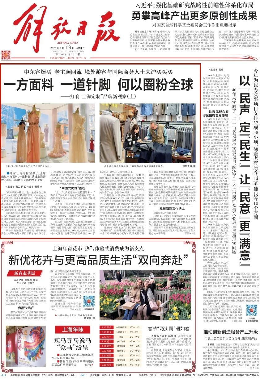 2月13日,《解放日报》头版头条、上观新闻报道:诠释当代东方美学的瀚艺(HANART)旗袍、GRACE CHEN(瑰丝·陈)的高定沙龙,“上海定制”已然成为促进境外游客与国际商务人士来沪买买买的“新抓手”。“上个月,我们迎来一位特别的客人。”在长宁区安化路上的瀚艺旗袍制作工坊,上海非遗技艺传承人张琛说——几天前,一位法国人进店后见到张琛就问“你还记得我吗”。原来,客人10年前随卡地亚VIP考察团短暂到访瀚艺,并当即定制了一套新中式男装。这次来,是因为他看到华裔女孩安琪分享的视频,惊喜地发现视频里的工坊正是他去过的那家。于是,他又一次叩开瀚艺的大门。吸引力正随着中国免签“朋友圈”的持续扩容,愈发清晰可感:瀚艺近半数客人来自海外,GRACE CHEN的外籍客户占比约20%。