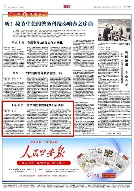 2月12日,《人民公安报》要闻版报道:春节临近,上海街头年味渐浓。2月8日23时许,上海市公安局长宁分局天山路派出所指挥室内依然灯火通明。突然,警情预警系统弹出一条消息:某小区居民刘女士与张先生家,近一个月内多次被周边邻居投诉有吵闹声,2月8日当天就有两次报警记录。邻居称,刘女士与张先生的争执声很大。但是民警多次上门,夫妻二人都否认吵架,不愿多谈家事。天山路派出所依托警情预警模型,在“最强大脑”支撑下,启动“民警+社区网格员+心理咨询师”联动机制,变“被动劝和”为“主动化解”。据介绍,2025年以来,依托警情预警模型,天山路派出所已化解各类重复警情纠纷38起,通过“前期沟通+现场调解+后期随访”形成处置闭环,实现矛盾纠纷“早发现、早介入、早化解”。