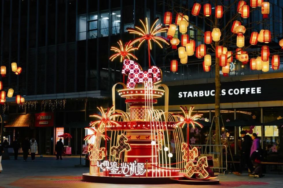 商场以“海棠花纹理”为灵感,融合马年专属的幸运小马形象,打造别具仪式感的新春打卡地。5米高的烟花许愿池主题装置将持续点亮,寓意心愿随光启航;长廊悬挂着写有“发财”“平安”等吉祥话的祈福灯笼,更隐藏着马年专属祝福等待市民探索发现。
