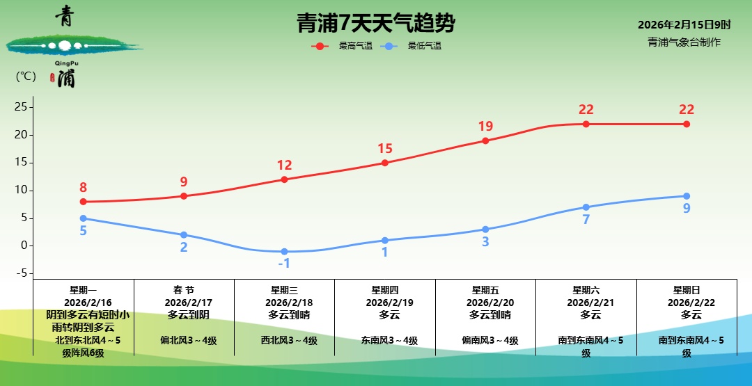 今天白天青浦区以多云天气为主,最高气温仍较高,夜里起受较强冷空气影响,有一次大风降温过程,并伴有小到中雨。2月17日-22日,以多云到晴天气为主,气温逐日回升。