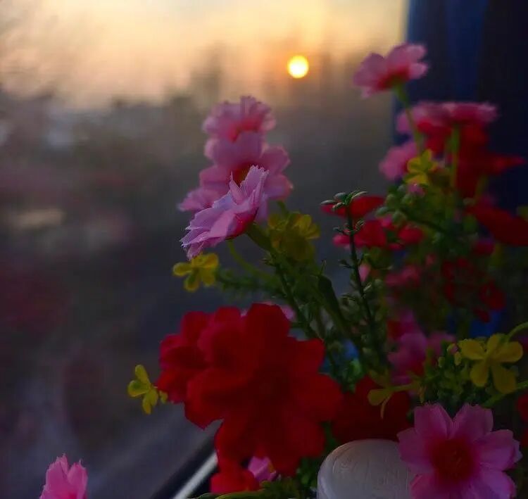 有时,车厢里的一束假花会闯入镜头。它的色彩在朦胧的晨光里显得格外鲜艳,与窗外那轮小小的太阳形成了奇妙的呼应。一边是人造的、静止的美,一边是自然的、流动的光,它们在车窗玻璃上短暂相遇,又迅速分离,就像我在旅途中遇到的每一个人,每一段故事。