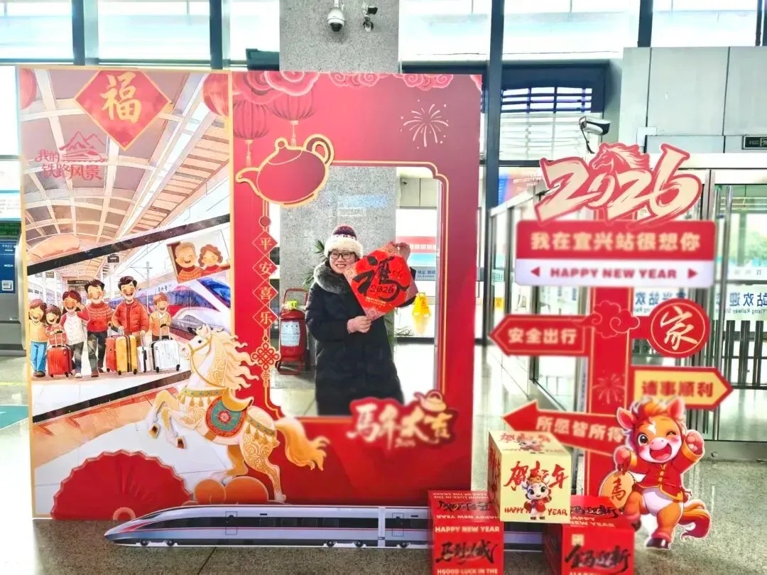 旅客在宜兴高铁站拿着福字拍照打卡。