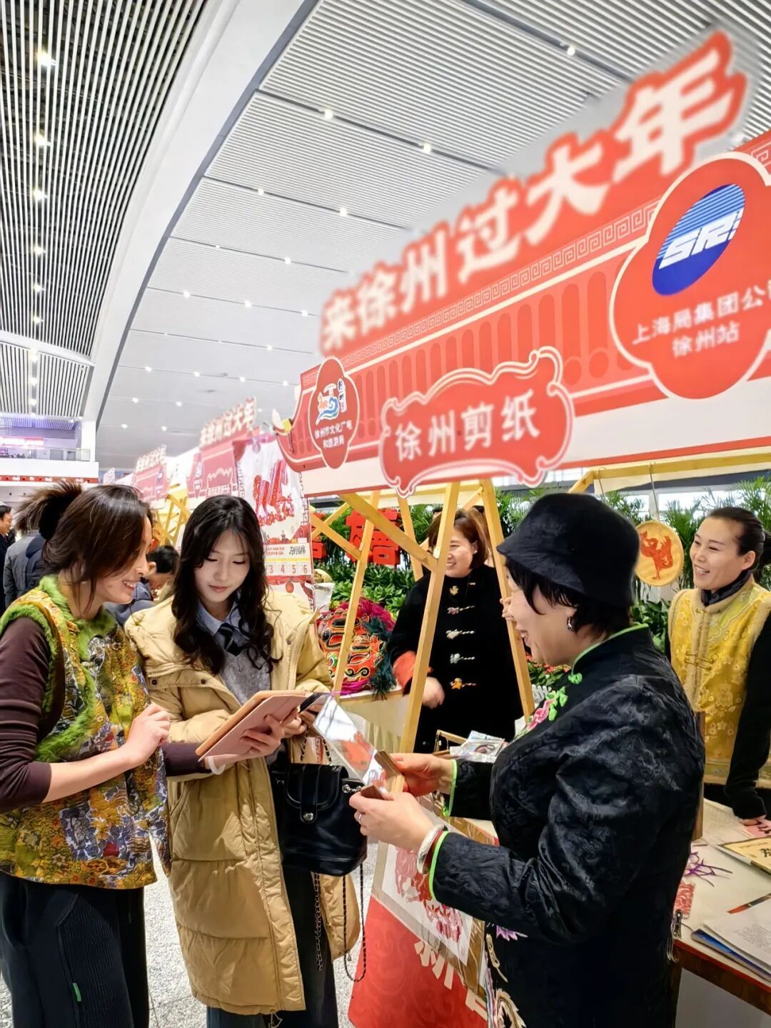 徐州东站候车大厅举办“来徐州过大年”非遗展示活动。徐州剪纸、马庄香包等传统技艺走进高铁站,让铁路风景与非遗文化相伴,旅客在归途中沉浸彭城年味,体验“文旅伴归途”的温馨氛围。