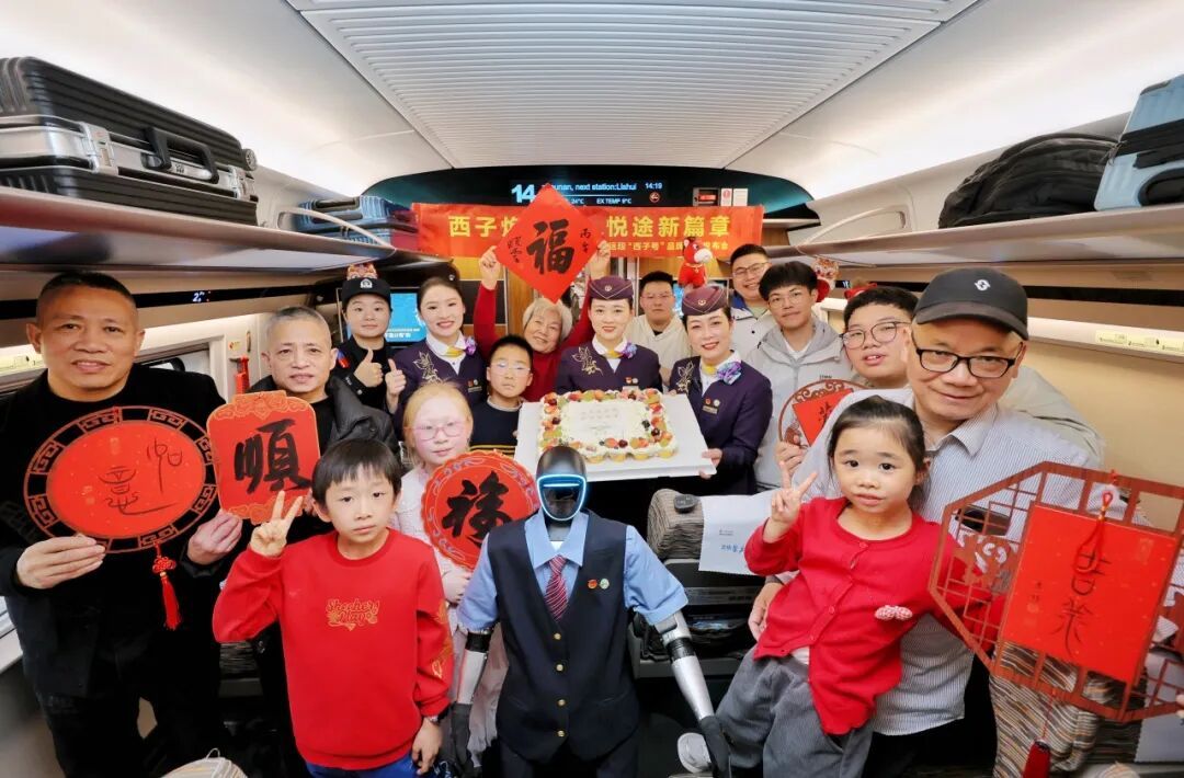 旅客在G41次高铁上与机器人及乘务员合影。