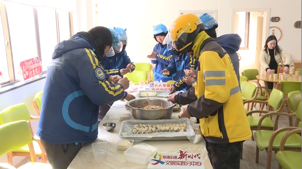 “吃饱了,就不想家了。”小王旁边是一位年轻的美团骑手,孤身来奉不过两个月,新春活动上,街道还为大家准备了一些零食礼品,还有过年的装饰品,热热闹闹的氛围里,对家乡的思念被冲淡,成为被人惦记着的欣喜,“过年的氛围特别热闹,对我们这些打工的来说,心里特别开心。我们也喜欢吃饺子,但平时没空。吃饺子,确实有家的味道,踏实。”
