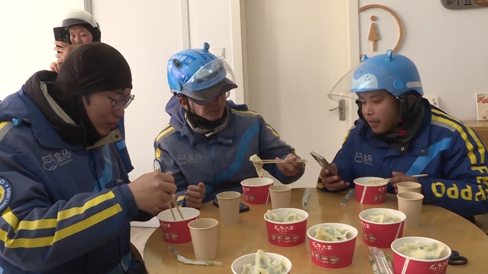 “今年春节不回了,因为这边福利高,就想着多挣点钱。”骑手小王是今天饺子包得最多的,他告诉记者,“我在家经常包饺子,这边上班忙,很少像今天这样包饺子了。所以今天感觉特别温馨,就像在家里一样,大家围在一起,特别有年味。”