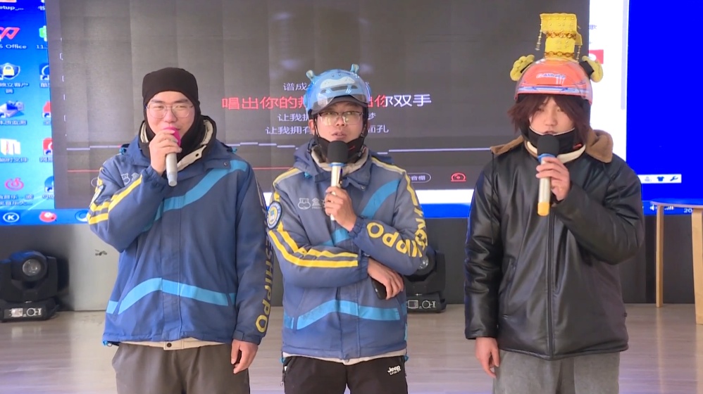 饺子的热气还未散尽,歌唱比赛随即开场。没有专业评委,没有打分细则,骑手们举手表决,图的就是一个“乐”字。《友谊地久天长》《明天会更好》《恭喜发财》……大家轮番上阵,唱到尽兴处,全场自发跟唱,场地瞬间成了临时KTV。笑声、掌声、喝彩声交织在一起,把这个没能回家的春节,填得满满当当。