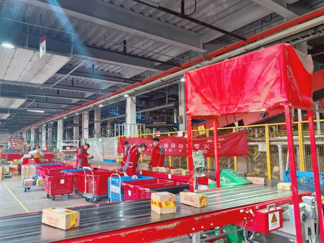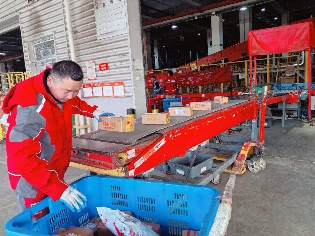 2月12日下午,京东亚洲一号上海嘉定物流园一区兴邦营业部内,传送带缓缓转动,包裹一件接一件从分拣口滑出。配送员们站在分拣带两侧,眼疾手快地取走属于自己片区的快件,扫码、理货、装车,动作利落。