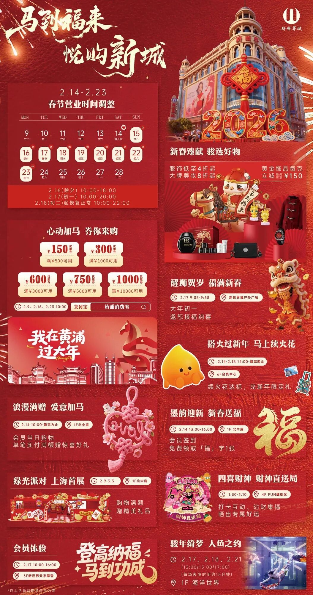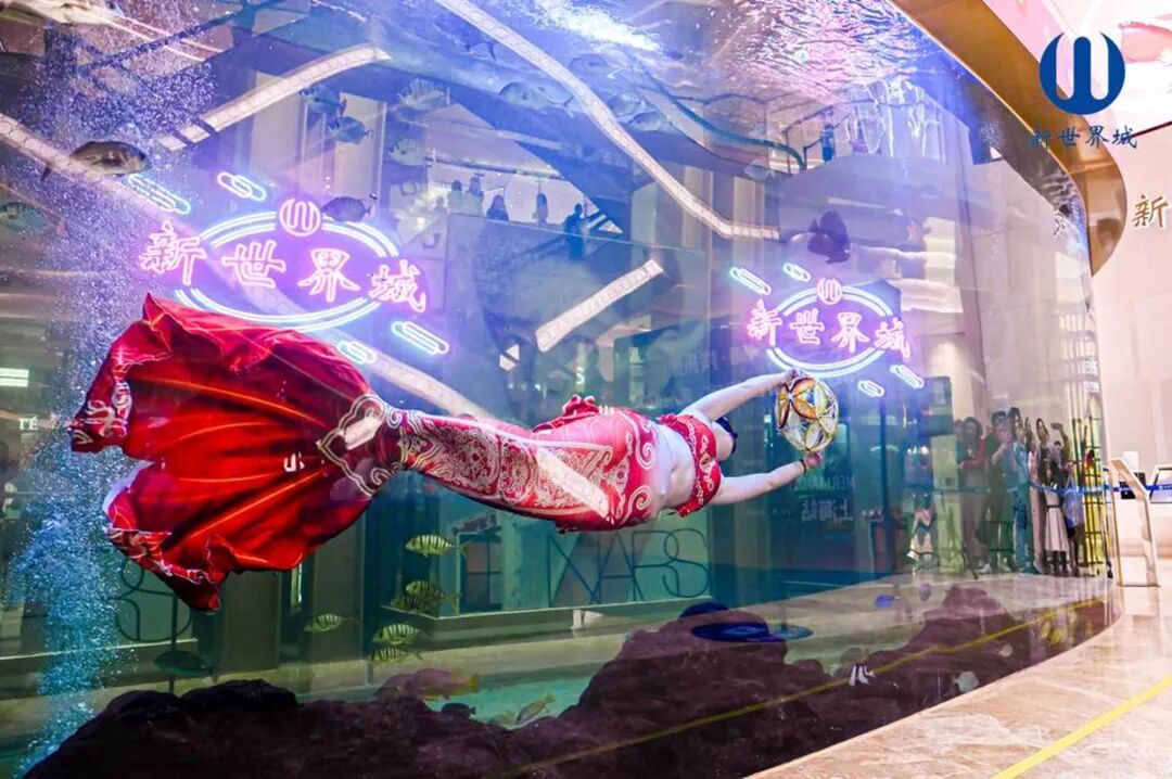 民俗体验方面,大年初一(2月17日)9:38~9:59,新世界城户外广场将举办“醒狮贺岁”表演邀请市民前来接福纳喜,感受传统文化年味。沉浸式互动活动同步开展,3F新世界天宇攀登区域推出“登高纳福,马到成功”活动,符合要求的挑战者在规定时间内完成51.28米挑战即可赢取精美伴手礼;1F海洋世界将于2月17日、18日、21日的13:00、15:00、17:00,上演“骏年绮梦·人鱼之约”沉浸式互动表演,融合美人鱼浪漫与骏年活力。