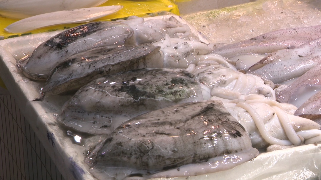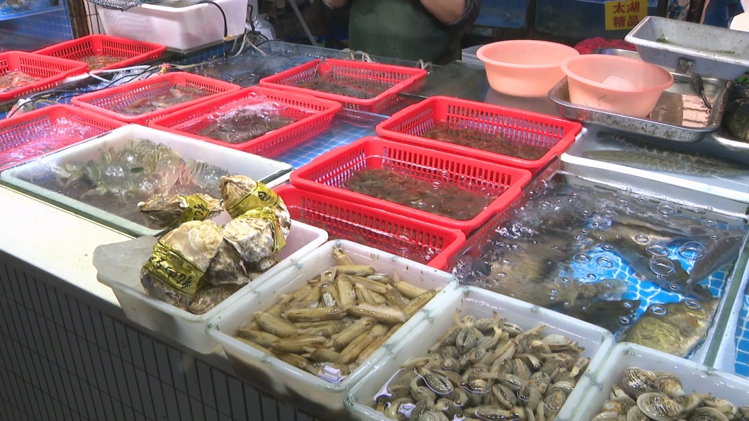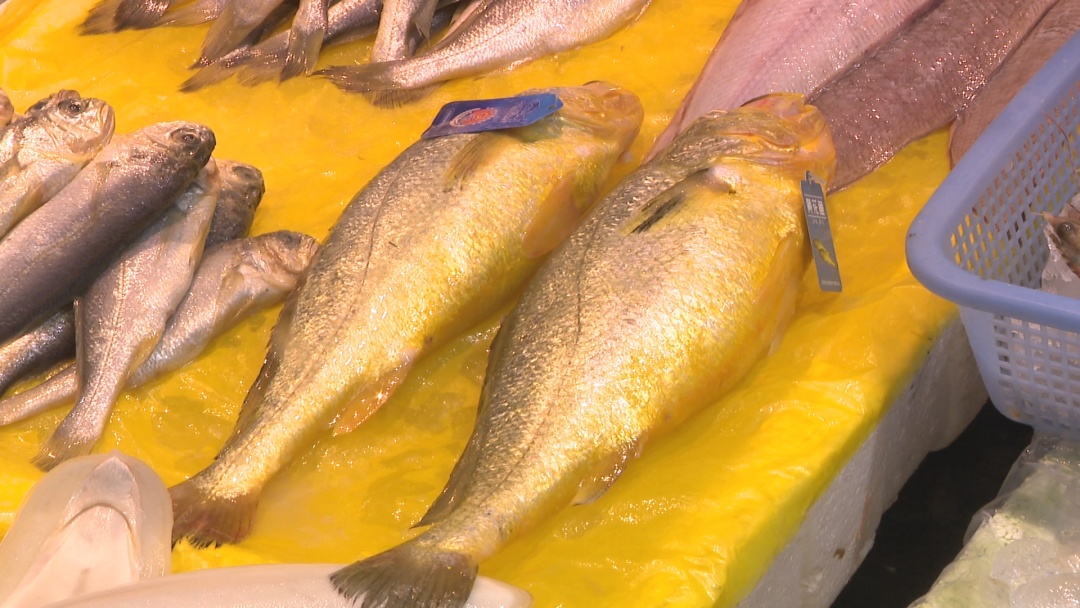 海产品摊位上,大黄鱼、带鱼、明虾、目鱼等品种透着光亮,新鲜程度一目了然。