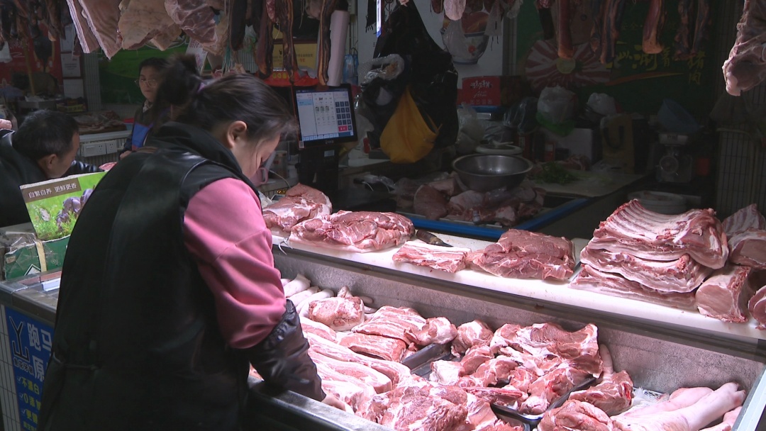 猪肉摊位上,夹心肉 、大排、五花肉、猪爪等品种琳琅满目。销量比前段时间增加8%至10%。“基本上价格没有涨,与平时价格差不多。物流都很正常。夹心、五花肉这段时间卖得最好,上海人传统在过年的时候要水笋烧肉,所以五花肉销量比较大一点。”