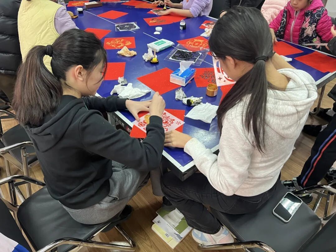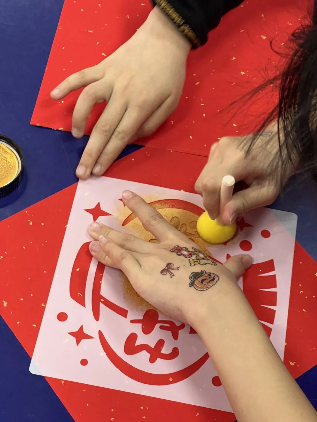 看着自己拓出来的图案越来越清晰,孩子们凝神专注地投入创作,指尖翻飞间,一张张金灿灿的福字逐渐显现,过程中的专注与耐心,既是一场正念疗愈,也让大家在动手实践中释放压力、收获成就感。有些孩子创意满满,不仅拓出了工整的福字,还把奔腾的骏马拓得活灵活现,甚至边上不小心沾上的颜料都能转化为别样的装饰。“你看我的元宝是拼接款”“我的马头是金色的”……大家互相展示着自己的作品,手里捧着亲手拓的“福气”,心里美滋滋。