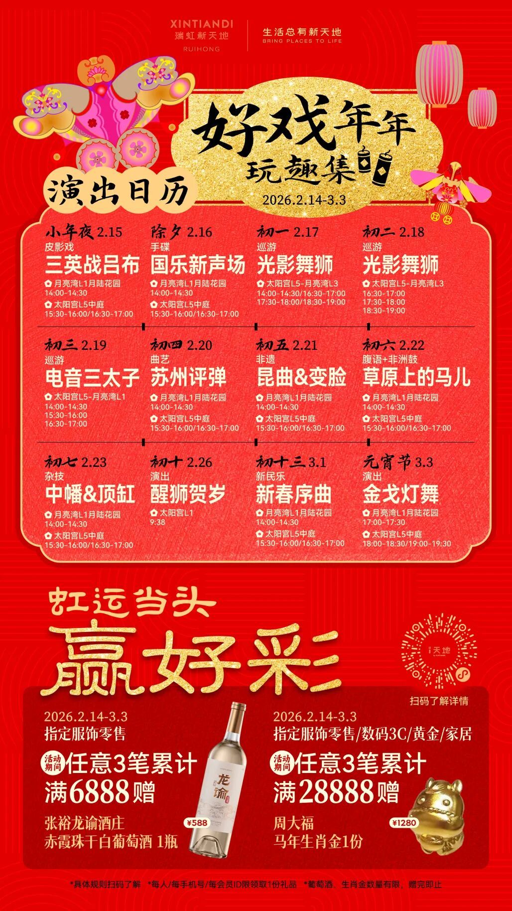 2月14日至3月3日,太阳宫五楼主中庭将变身充满传统趣味的游乐场。现场不仅设有丰富的趣味游艺互动摊位,更将轮番上演皮影戏、光影瑞狮巡游、非遗双萃、电音三太子等精彩演出,活动场地贯穿太阳宫与月亮湾,让节日的欢腾气氛从春节延续至元宵,不断档。