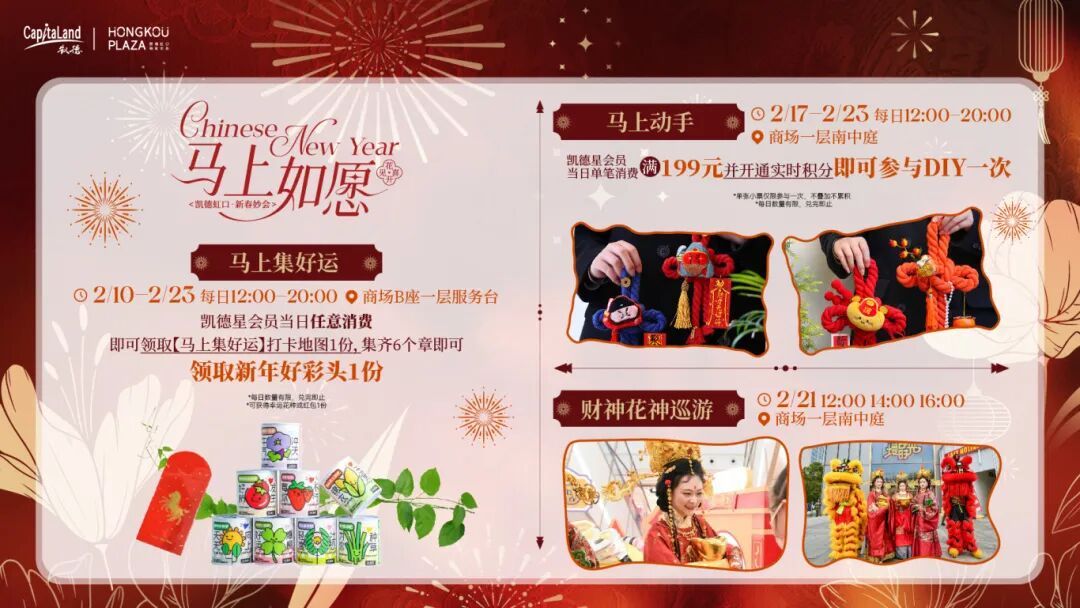 想考验好运气的,记得去B座服务台领一张“马上集好运”打卡地图,任意消费就能入手,集满六个章,新年好彩头稳稳落袋。手作爱好者别错过“马上动手workshop”,单笔消费满199元即可解锁DIY体验,把亲手做的小福气带在身边。2月21日,财神与花神将结伴巡游,从南中庭出发,一路派发开年好彩头。
