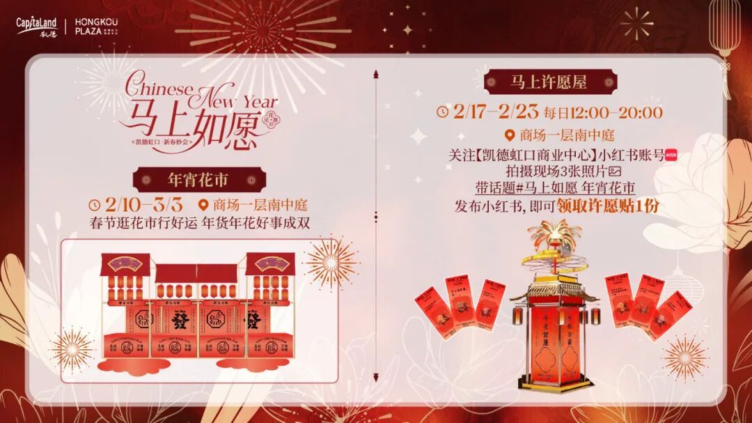春节期间,凯德虹口把马年福气铺满整座商场。一层南中庭的年宵花市率先开场,年花年货一字排开,逛一圈就把“好事成双”的好兆头带回家;旁边的“马上许愿屋”每日限时开放,拍三张花市美照发布小红书,就能领走一份许愿贴,把心愿挂进春光里。