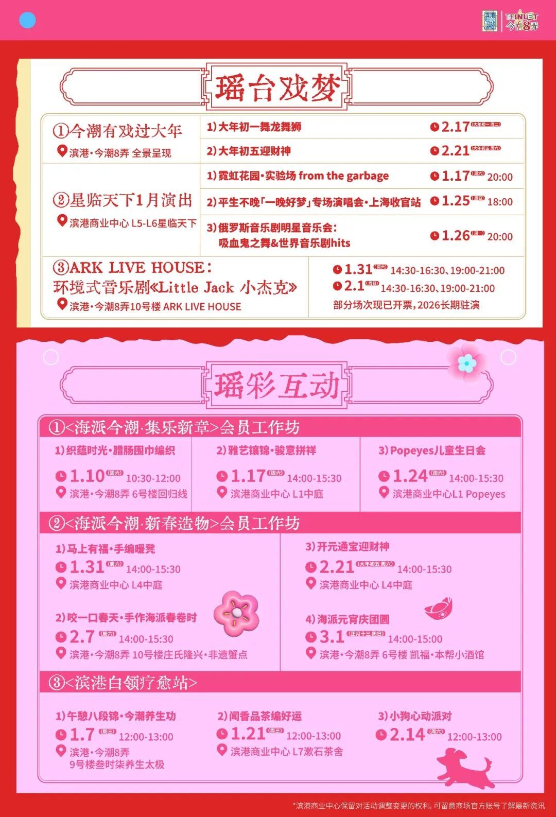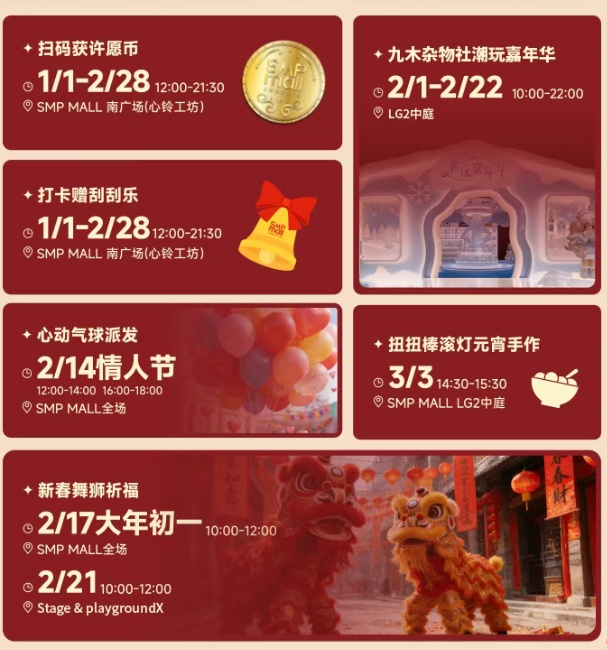 春节长假期间,舞龙舞狮、初五迎财神等传统民俗轮番登场,ARK LIVE HOUSE与星临天下带来音乐剧及专场演出;手作工坊涵盖海派春卷、元宵制作与节庆造物,更有宠物派对、打卡兑礼、消费积分翻倍及刮刮卡抽奖等互动福利,将老弄堂的年俗韵律与当代创意交织成一道可游、可赏、可玩的海派新春风景。