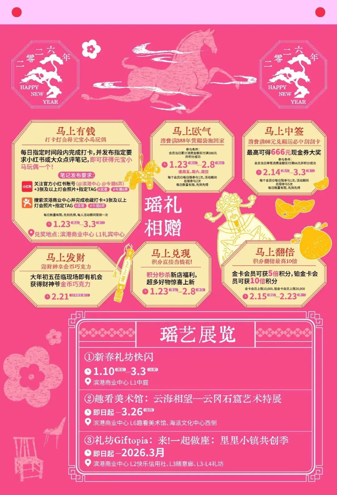 白玉兰广场以“红运加马”为主题,春节期间推出一系列新春活动。即日起至2月24日,单笔消费满199元即可凭小票至LG1服务台参与抽奖赢取杜哈夫6寸蛋糕等惊喜好礼。