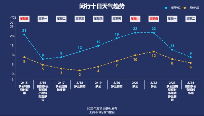 大年初一(17日)到年初五(21日)闵行区天气晴好,气温逐日上升。年初一和初二还有些冷,最低气温在2—3℃,白天最高回升至9—12℃。年初三开始有“大踏步”回暖,初四和初五最高气温可达22℃。假期后期受冷空气影响,有大风和降温过程,云系增多,伴有弱降水。请大家及时关注最新的预报信息。