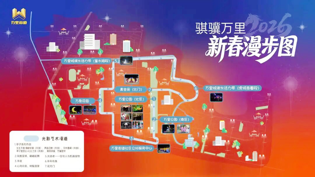 万象星光,邀您赏光。万里灯光艺术季,已为您精心点亮新春夜间慢行步道。诚邀您与家人挚友,共赴这场新春光影之约,在璀璨灯火里,邂逅家门口的年味与浪漫。