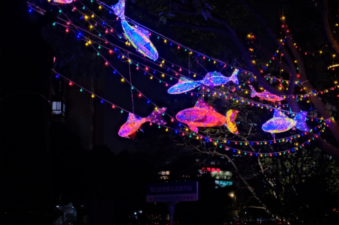 以“鱼”这一经典传统意象为核心,将灵动的鱼灯错落悬挂于街道上空,与万里的水系河道交相辉映,仿佛游弋于岸边与波光之间。入夜后,鱼灯亮起暖光,映照水面涟漪,构成光与水、人与自然的和谐画面,既呼应“年年有余”的吉祥寓意,传递富足安康的新年祈愿,又让传统意象融入街头日常,为社区街道添上一抹喜庆的新年色彩。