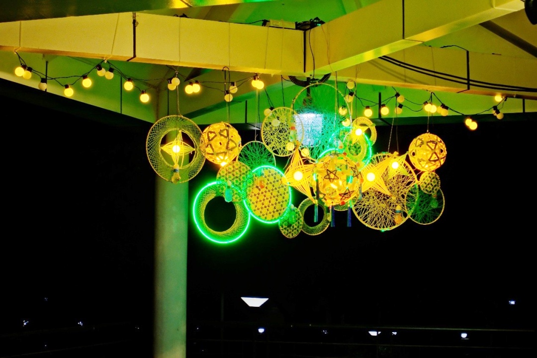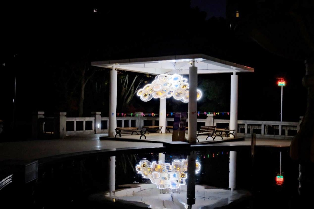 该装置以万里公园原有休憩亭为载体,通过现成品艺术创作,采用非遗手工竹编工艺,将圆形、四芒星等几何形态以竹篾编织呈现:细密的竹丝在匠人手作中形成通透纹理,内置的暖调光源穿透竹编肌理后,既保留了竹材的自然质感,又让光影随竹纹呈现出层次分明的斑驳效果。装置悬挂于亭檐下方,当夜色笼罩,大大小小不同层次的竹编圆环透出的“碎光”,与亭台的休憩空间形成互动⸺市民闲坐亭中,可触竹篾温度,可观光影柔波,传统手工艺借灯光与公共空间对话,为灯光节增添烟火气与人文质感。