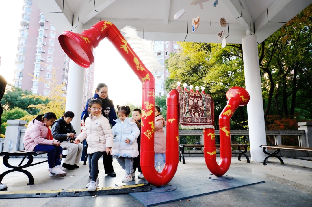 在万里社区,竹条在指尖翻飞,社区艺术家将邻里故事与非遗技艺共同编入经纬。这件高悬于亭子中心的竹艺装置,如同一个温暖的记忆容器⸺阳光穿过缝隙,洒下斑驳光影,仿佛将每份参与的温度定格。它以竹的柔韧,承载起独属于这里的社区情感,让传统手艺在人与人的相逢中。