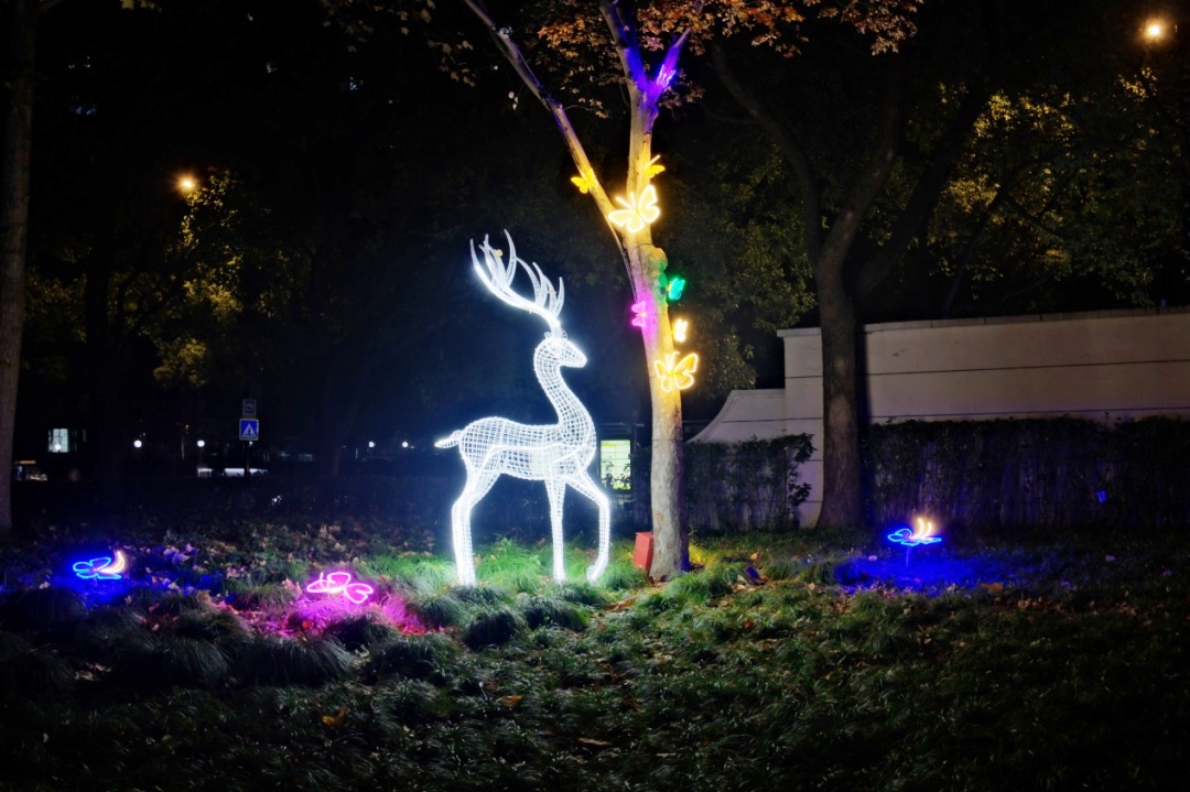 “瑞鹿呈祥”以森林灵鹿为形,美丽的蝴蝶在其周围翩翩起舞,融入社区绿色空间,既是林长制下生态建设的生动体现,也是自然与居住和谐相融的视觉象征。日间,居民在鹿影摇曳间感受森林气息,理解绿色守护的意义;夜晚,装置泛起柔和光晕,如月光洒落林间,唤起人们对生灵与家园的珍视。这不仅是一件公园的景观艺术小品,更是一处唤醒生态意识、传递人与自然共生理念的温情载体。