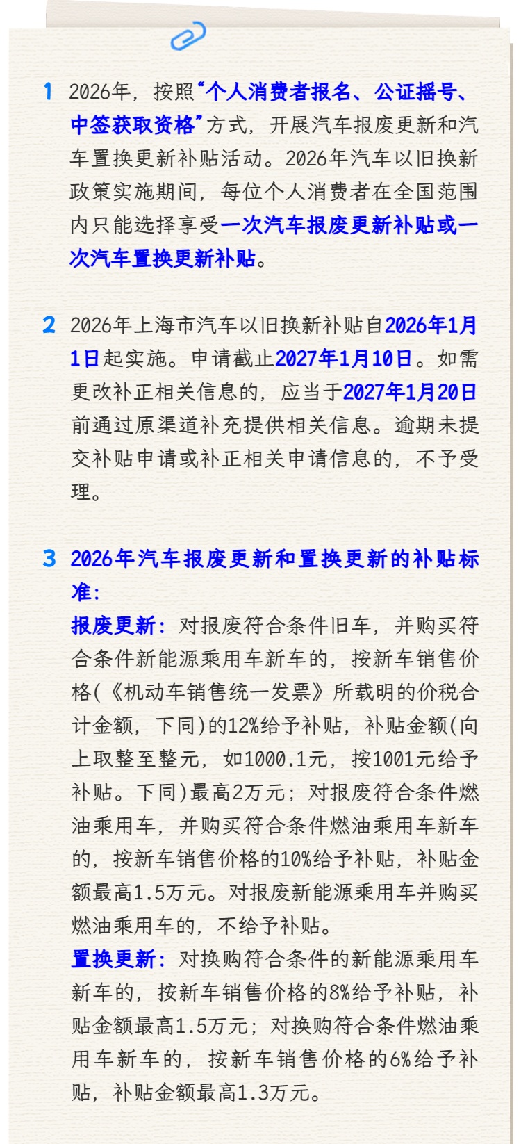 市商务委介绍,为保障消费者在春节期间更好享受以旧换新补贴,2026年3月2日(周一)进行我市2026年度汽车以旧换新活动第二轮摇号,欢迎广大消费者积极参与报名。详见↓ 2026年上海市汽车 以旧换新补贴活动 摇号公告(第二轮) 活动时间 报名时间:工作日7:00-22:00(报名通道已常态化开放,摇号当日报名入口暂时关闭) 摇号时间:2026年3月2日(第二轮) 查询时间:2026年3月3日起 报名对象 已取得我市汽车销售机构开具的有效《机动车销售统一发票》的个人消费者。提交报名时,个人消费者需提交新车发票、旧车车辆号牌、身份信息等。 需要注意的是,个人消费者提交报名信息时,平台将对接国家税务总局全国增值税发票查验平台,对上传的新购车辆发票进行实时校验。发票未通过校验的,将无法完成报名。 报名渠道 符合条件的个人消费者可在规定时间内通过点击文末左下角“阅读原文”链接进入报名入口。个人消费者报名时需填报并授权平台使用相关个人信息,包括姓名、手机号码、身份证件号码、旧车车牌号、新购车辆发票等信息。 摇号中签 个人消费者报名信息将提供至第三方公证机构,在第三方公证机构监督下限量摇号抽取中签个人消费者。个人消费者可于2026年3月3日起通过原报名渠道查询中签结果。 中签资格无需领取或上传,补贴审核系统将直接根据摇号结果对申请人资格进行审核校验。 补贴申请 中签消费者应当于2027年1月10日前通过全国汽车流通信息管理系统网站或“汽车以旧换新”小程序提交汽车报废更新补贴申请,或者通过“上海商务”微信公众号、“车信盟”等平台提交汽车置换更新补贴申请。如需更改补正相关信息的,应当于2027年1月20日前通过原渠道补充提供相关信息。逾期未提交补贴申请或补正相关申请信息的,不予受理。 温馨提示 (一)参加报名摇号和申请补贴的消费者应为同一人(同一身份证件类型和证件号码)。补贴中签资格仅供本人使用,不得转让。 (二)参加摇号报名的个人消费者,若当次未中签,后续无需再次提交报名信息,摇号系统将自动将前期未中签消费者纳入下一轮摇号。 (三)为方便消费者报名,报名时无需选择报废更新或置换更新。取得中签资格的消费者可以提交报废更新或置换更新补贴申请(只能选择其一)。 (四)报名摇号仅为补贴资格发放阶段,不代表成功申报补贴。消费者中签后需在规定时间内提交申请,后续审核阶段如发现申请材料不符合相关条件,仍予以审核不通过。 (五)2026年我市汽车以旧换新补贴资金使用按照“总额控制、用完即止”原则实施,请有意向的消费者抓紧报名。已中签的消费者,请及时提交申请,以免影响补贴申领。 (六)自《实施细则》发布之日起,至最后一轮摇号前一日,每个工作日7:00至22:00消费者均可提交报名。后续轮次摇号时间,请持续关注官方公告。 咨询电话 400-820-3152 (工作日9:00-12:00;13:00-17:00)