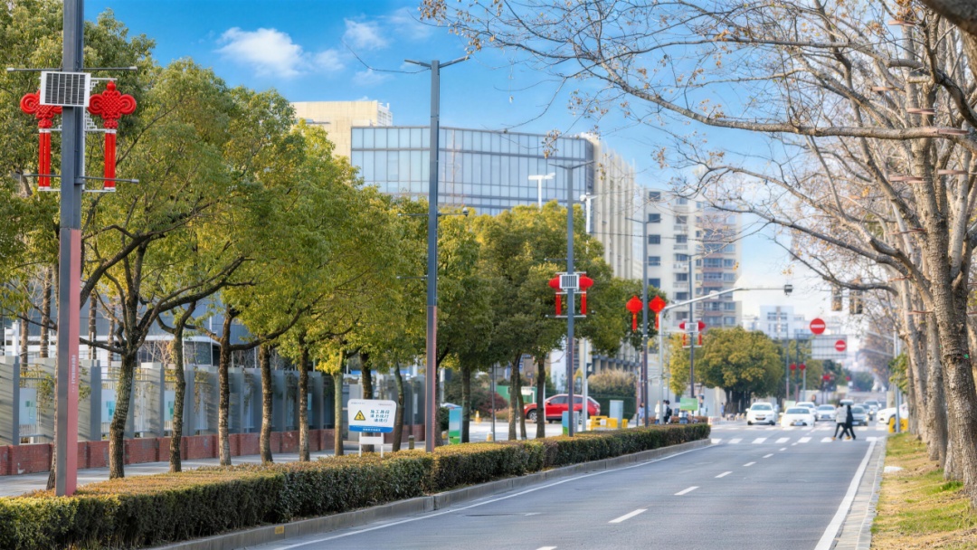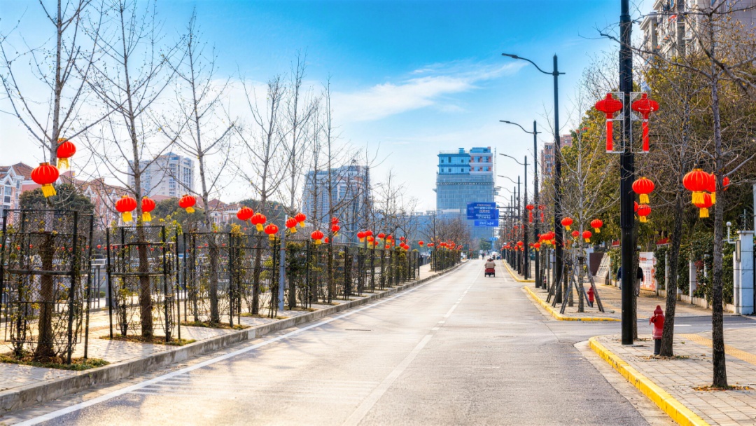 从东到西,江洲路化身为一条红色的光影河流。数百盏大红灯笼在枝头整齐高挂,形成连绵不绝的壮观长廊。漫步其下,仰角拍摄灯笼纵深,年味的仪式感扑面而来。