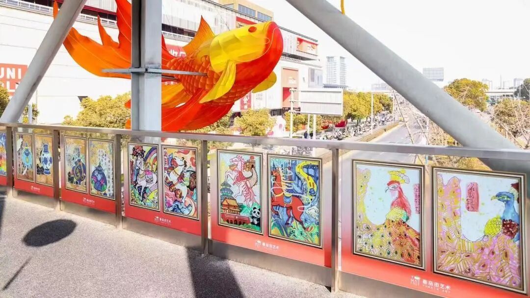 步入欢乐颂,第一眼就会被空中游弋的巨型锦鲤鱼灯所震撼。设计取自“年年有余”的吉祥寓意,鱼身鳞片光影流转,宛如在星空中畅游。最佳机位在一楼仰拍,让绚丽的鱼灯充满画面,仿佛锦鲤正从头顶跃过,寓意新年好运腾飞。夜晚灯光全开时,更是如梦似幻。步入走廊,还可观赏马年生肖文化展,孩子们用天马行空的想象,让画笔下的骏马栩栩如生。