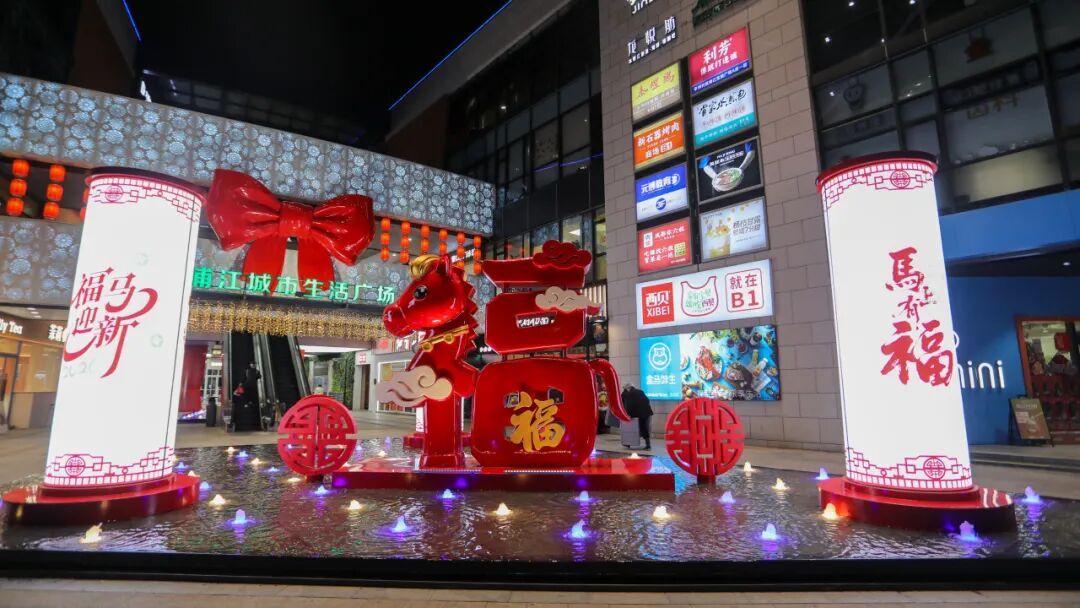 这里是童趣与活力的交汇点。广场前的音乐喷泉随着节日旋律舞动,水珠在阳光下折射出小小彩虹。而一旁憨态可掬的新春小马雕塑,身披红色鞍辔,是孩子们最爱合影的“吉祥物”。