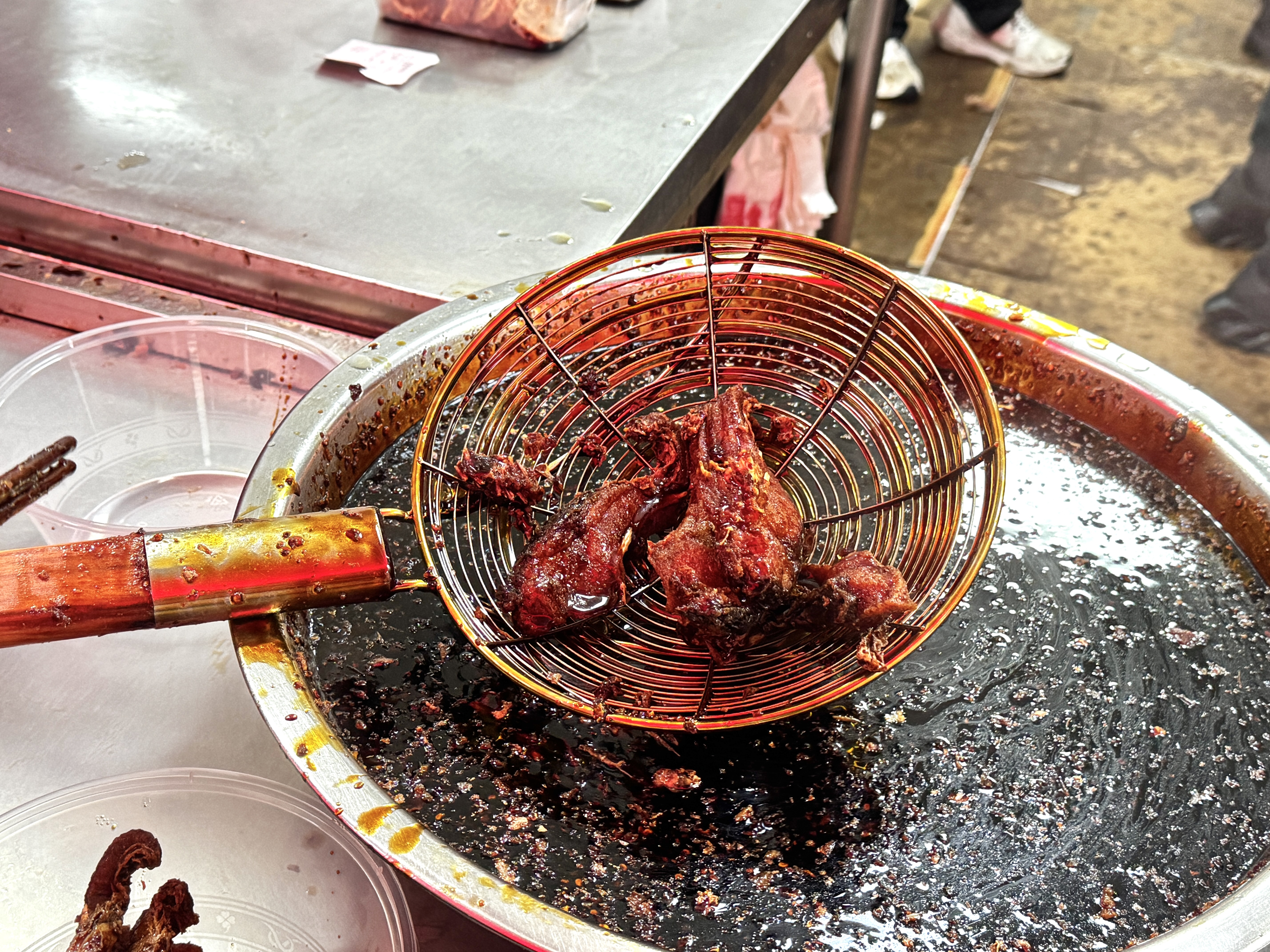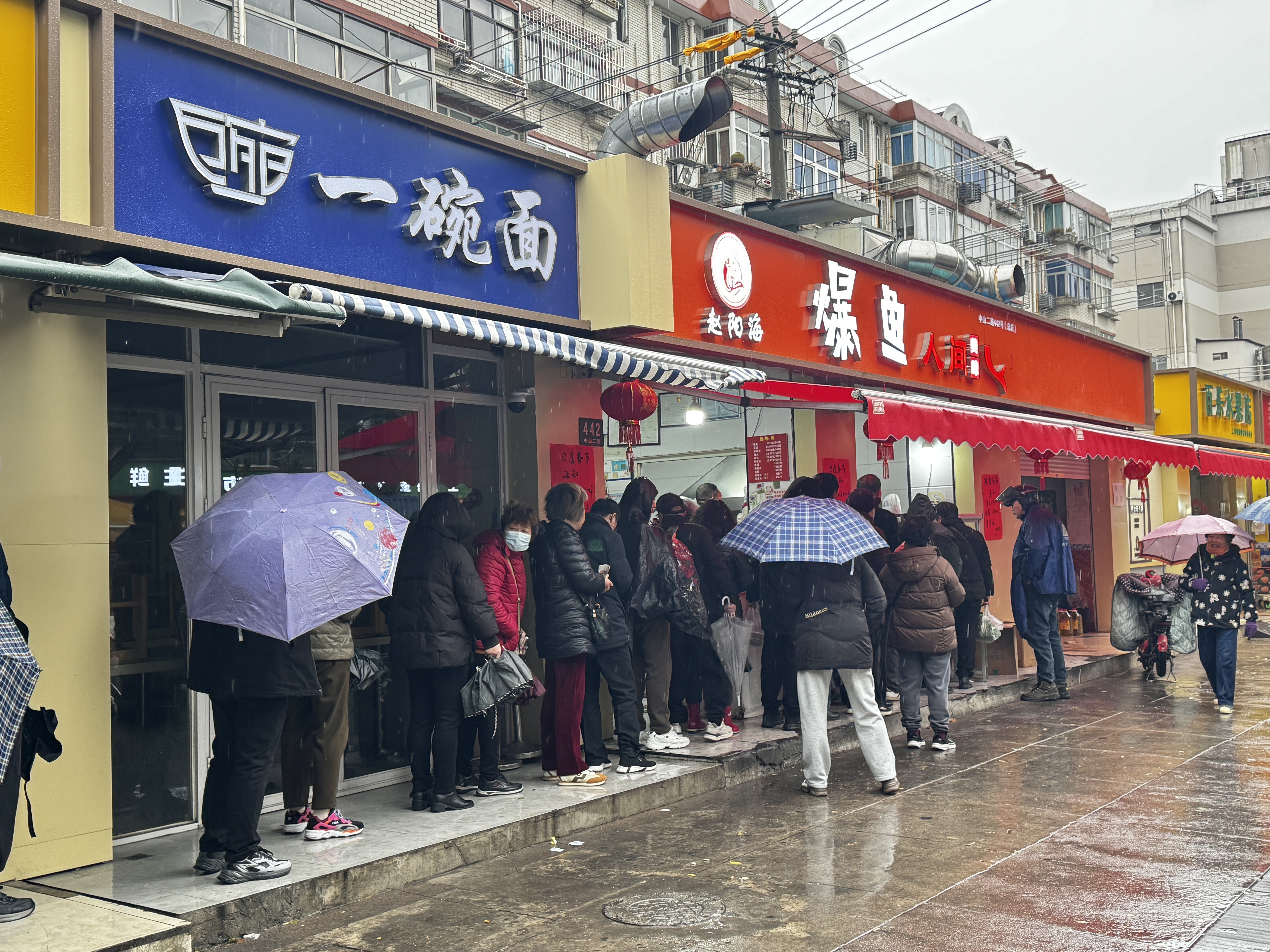 除了生鲜食材,“老字号”熟食店同样迎来销售高峰。尽管清晨小雨淅沥,但在一家“老字号”爆鱼店前,等候的顾客早已排起了三十余人的长队。后厨油锅正旺,师傅手持长筷,将切好的鱼块轻轻滑入滚油之中,出锅的爆鱼趁热浸入酱汁,吸饱汤汁后捞出沥干,油亮红润,香气扑鼻。作为上海传统宴席“老八样”中的经典年菜,爆鱼寓意“年年有余”,是不少市民除夕餐桌上必不可少的一道美味。市民王先生表示,每年过年,餐桌上都少不了这道爆鱼,“鱼块表皮酥脆,味道咸中透甜,家里人都爱吃。”