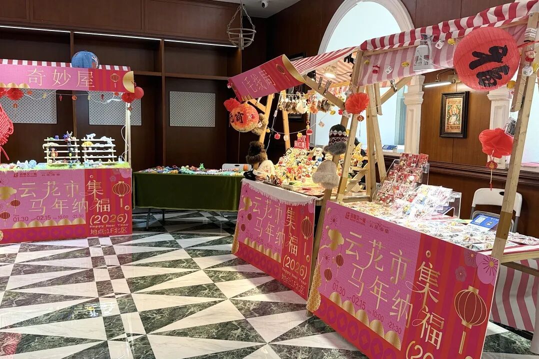 行至百联又一城,“云花市集”已悄然开市。这场持续至2月15日的市集,不似传统年货大卖场的喧嚣,更像一处藏身商场的“新春会客厅”。细长的展台上,绒花发簪、盘扣胸针、手工编织的小玩偶错落陈列。
