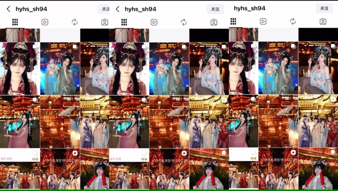 做完造型,三人跟着摄影师出发去灯会,拥挤的人潮中,摄影师熟门熟路寻找最适合出片的场景和角度,为她们拍下一张张极具中式美感的写真。