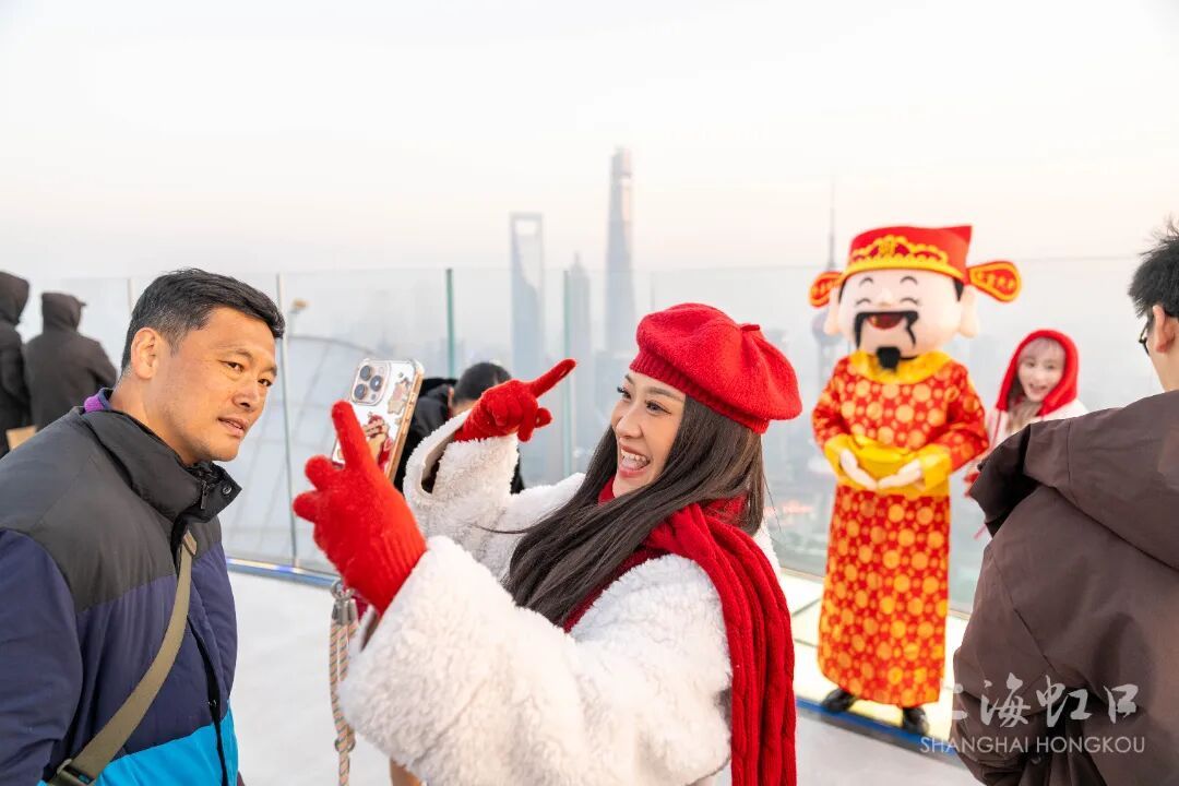 The Stage白玉兰观景台 推出“马年·乘风而上,喊话全世界” 新春主题活动 在320米城市高空 特设心愿祈福装置 游客可登高望远 对着浦江与天际线许下新年心愿 将祝福声传向远方 从2月17日大年初一开始 “福、禄、寿、喜、财”五路神仙 将随机现身观景台各个点位 与游客近距离互动