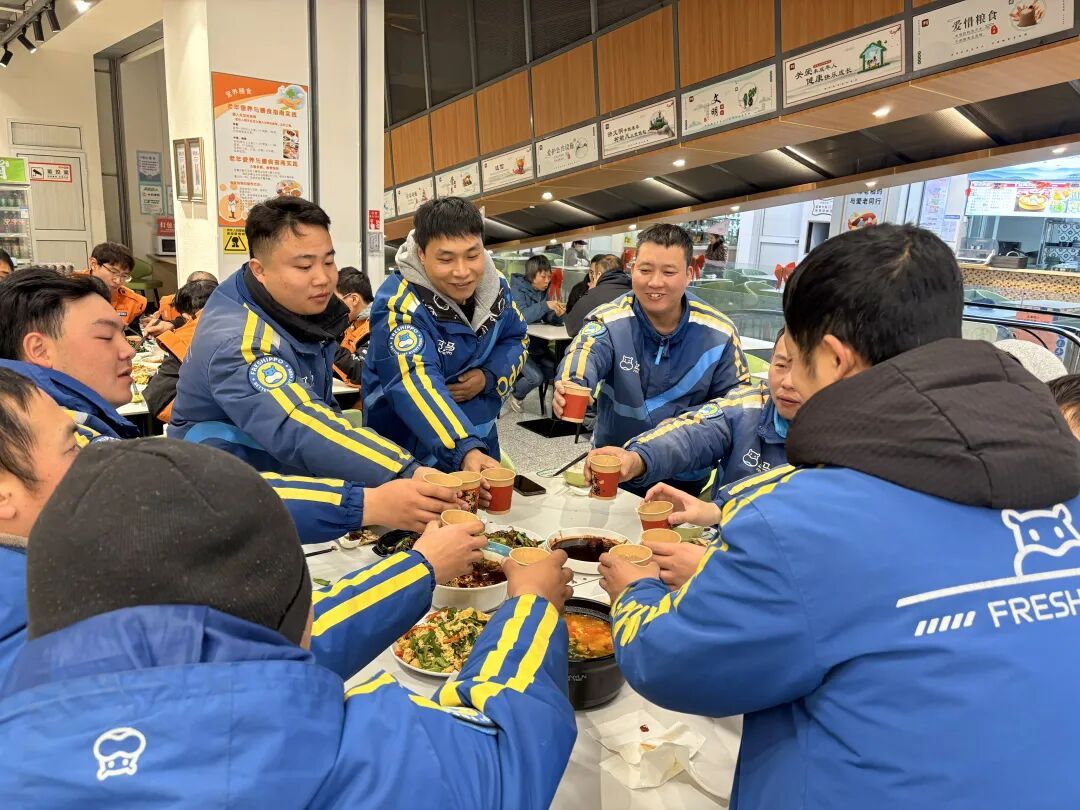 骑手们在社区食堂里一起吃团圆饭