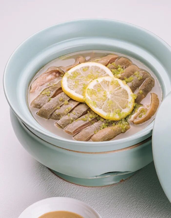 “宁宁”了解到,这道菜对乳鸽的品种和鸽龄要求非常严格,要选用脂肪少的白玉王鸽种,乳鸽经特制卤水泡制,烹制后,色泽金红、皮脆肉嫩,口感鲜而多汁。金汤瑶柱花胶鸡,是市民唐女士推荐的经典菜,“胶原蛋白丰富,天冷喝一碗热乎乎的汤,整个人都舒服了。”