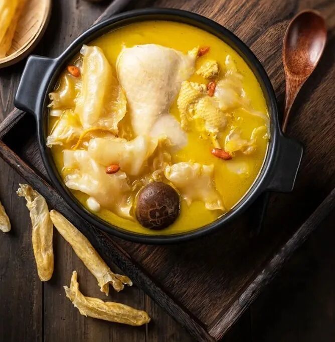 店员介绍,这道滋补佳肴融合广式煲汤精髓,很有节庆寓意,其精选供港麻黄鸡、土猪筒骨、金瓜等食材,结合传统工艺精心熬制汤底,配上深海真花胶,文火细煨熬制。