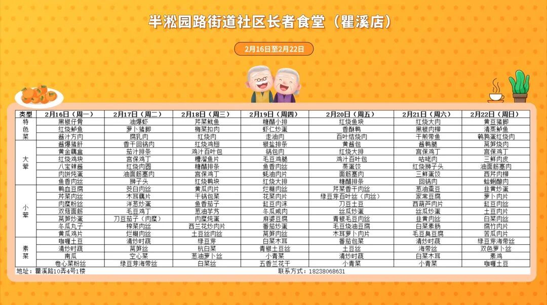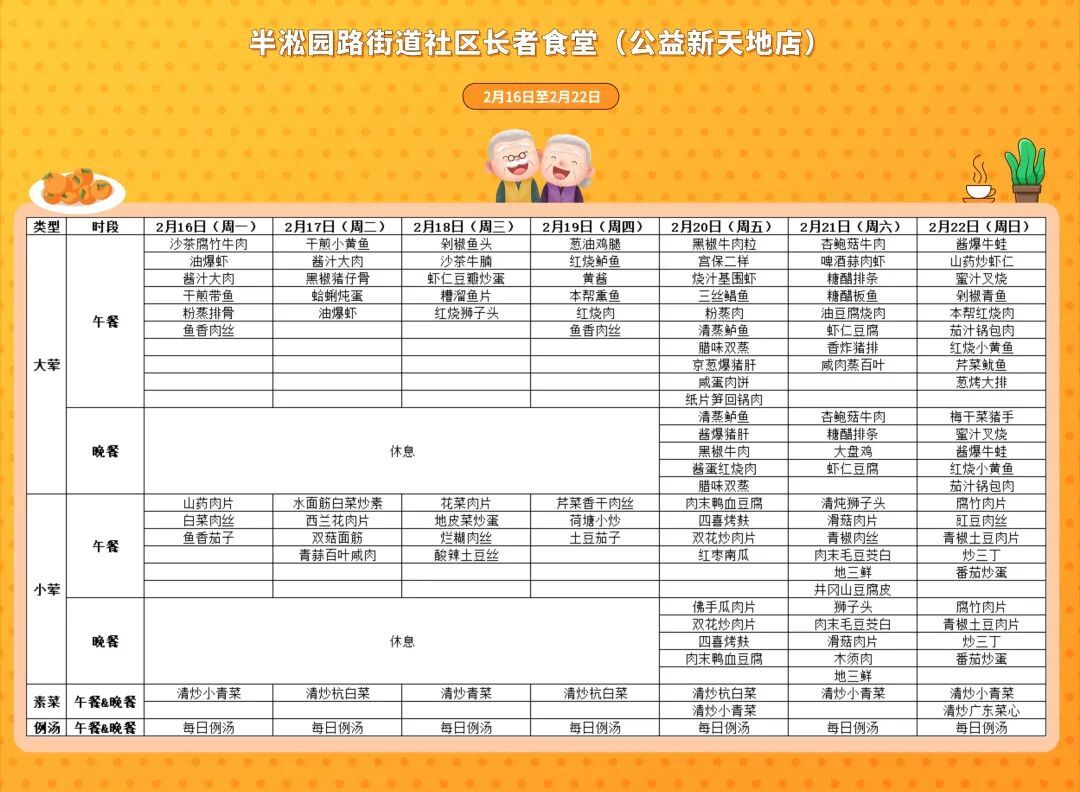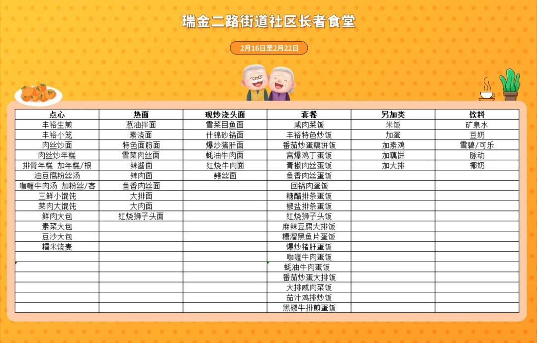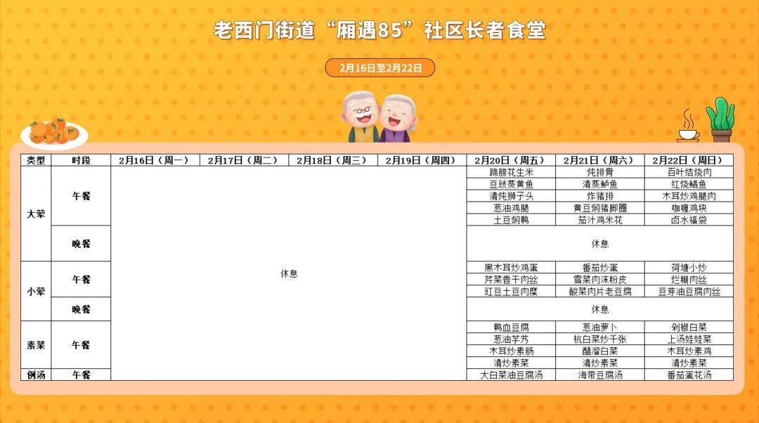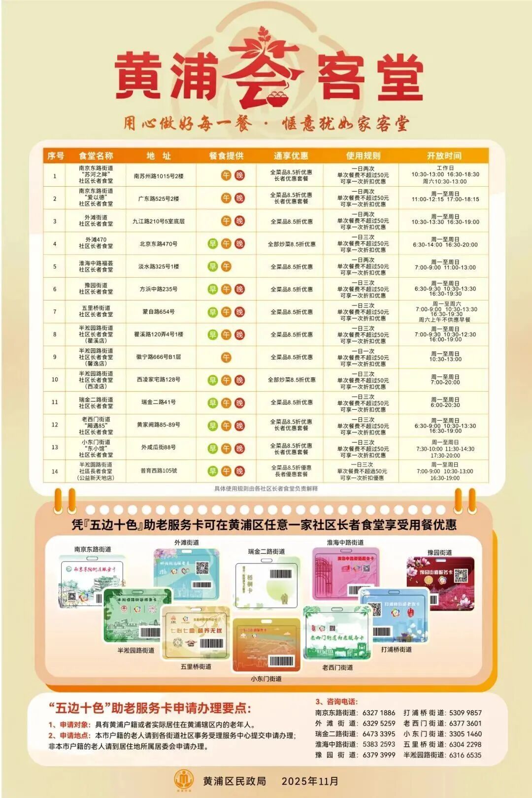 户籍地或居住地在黄浦的老人,凭“五边十色”助老服务卡,即可通享全区14家社区长者食堂统一8.5折用餐优惠,加上过去三年推出的多批老字号长者餐厅,全区通享助餐场所达到65家。